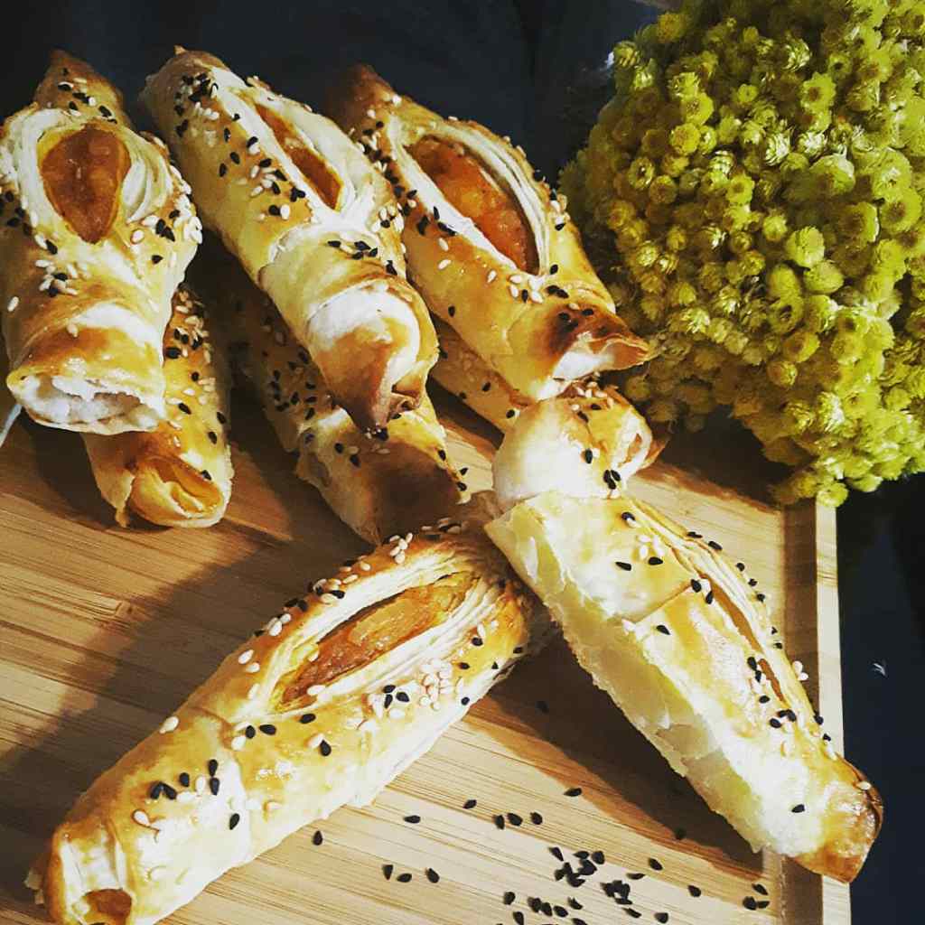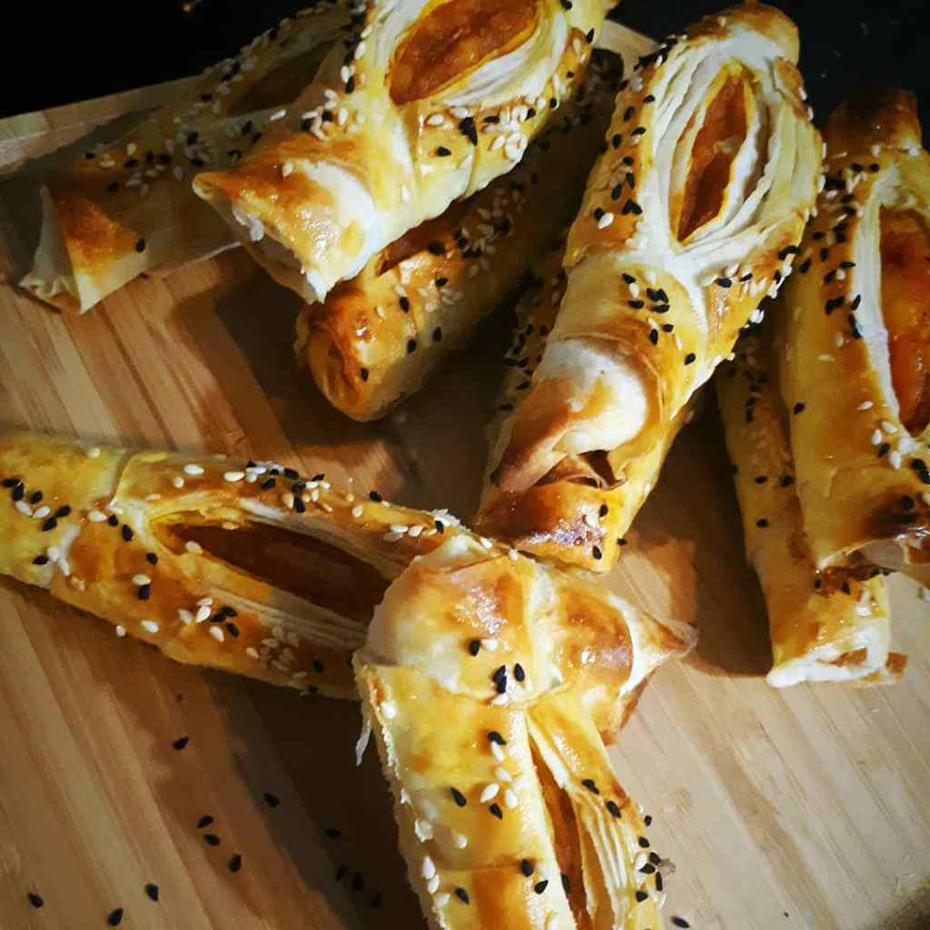 - 1 tane yufkamızı serelim. Üzerine sosumuzu dökelim.2. yufkamızı serelim onuda soslayalım. Daha sonra sigara böreği gibi 12 parçaya bölelim. Patatesleri pay ederek saralım. Tepsiye yağlı kağıt serelim ve üzerine dizelim. Daha sonra yumurtalarını sürüp, çörek otu serpilir.