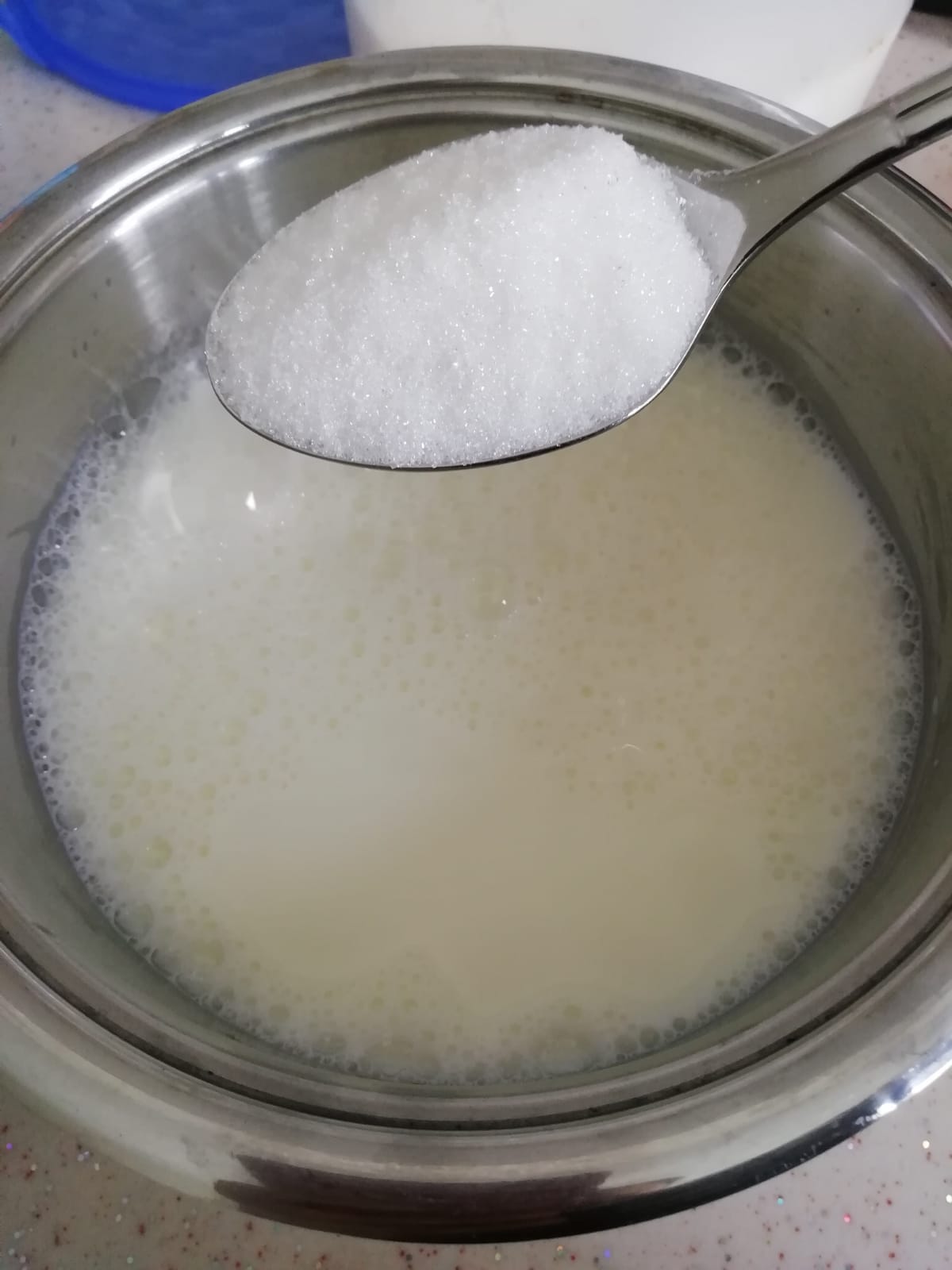 - Muhallebi için süt, şeker, nişasta ve un bir tencereye aktarılır ve göz göz olana kadar pişirilir.