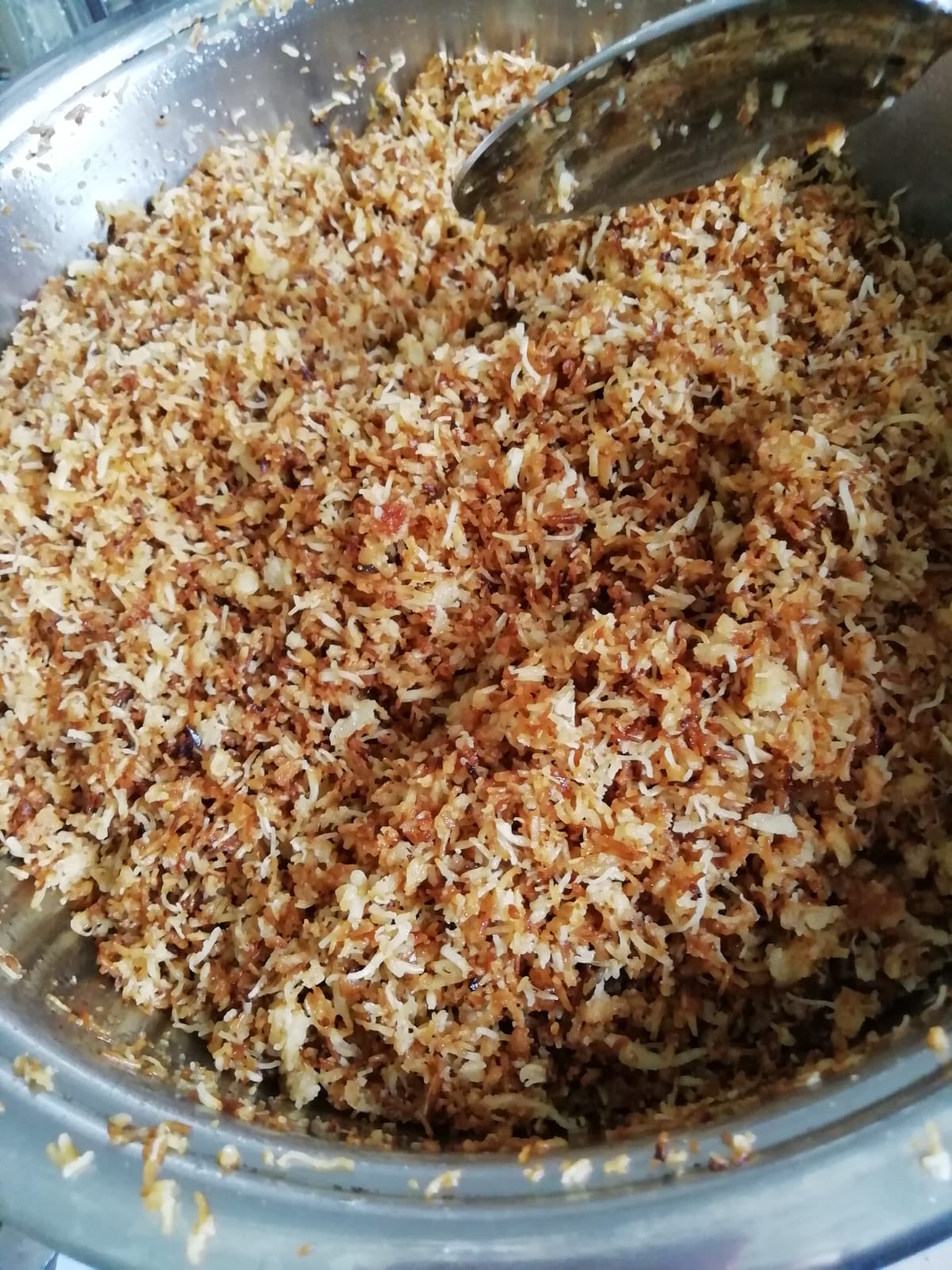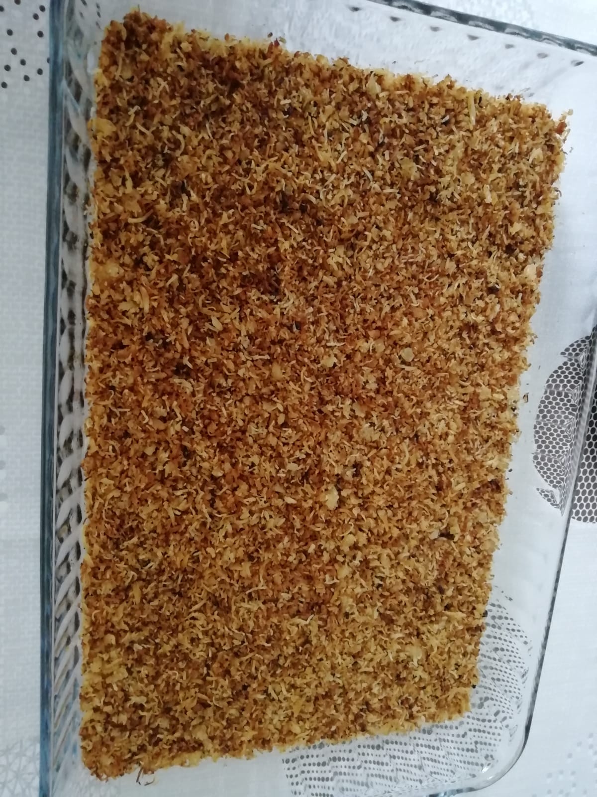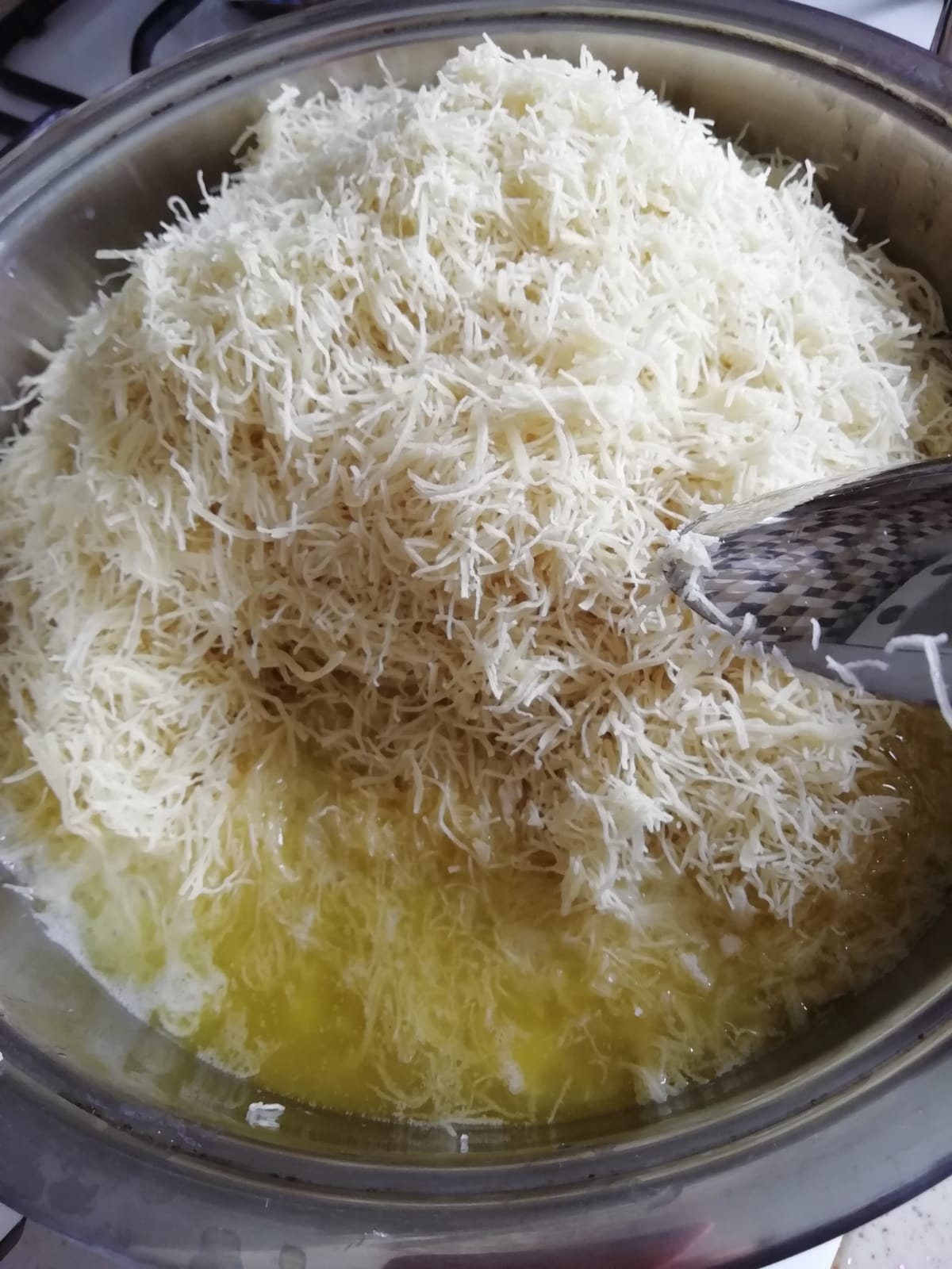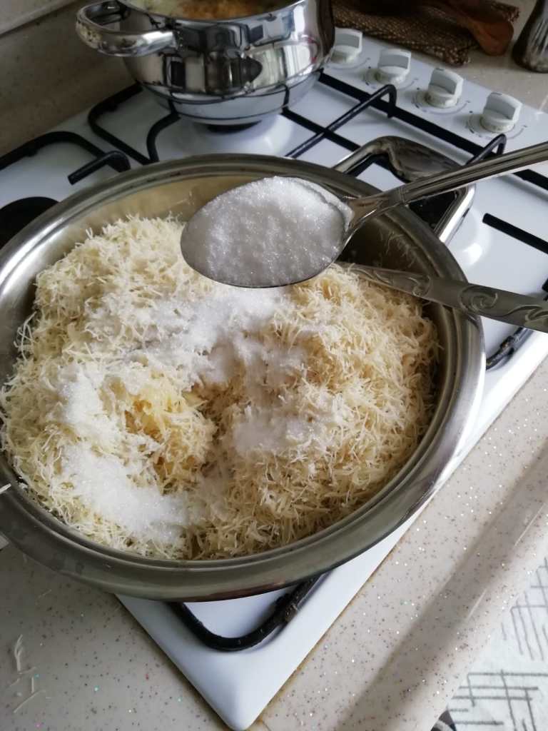 - Tereyağı veya sanayağ eritilir. Tel kadayıf ve şeker eklenir. Kızarana kadar kavurulur.