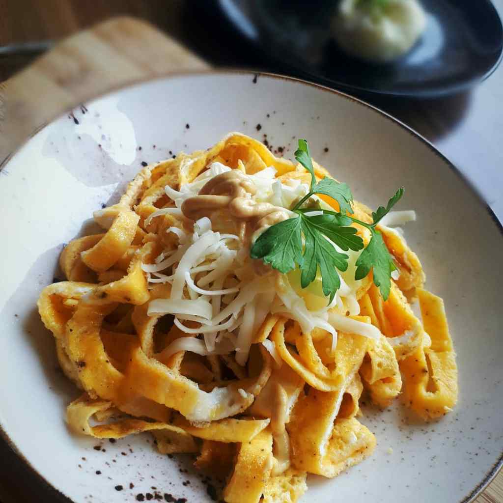 - Hazırlanan omleti dürüm şeklinde sarın. İstediğiniz boyutta doğrayın ve tabağa alın.