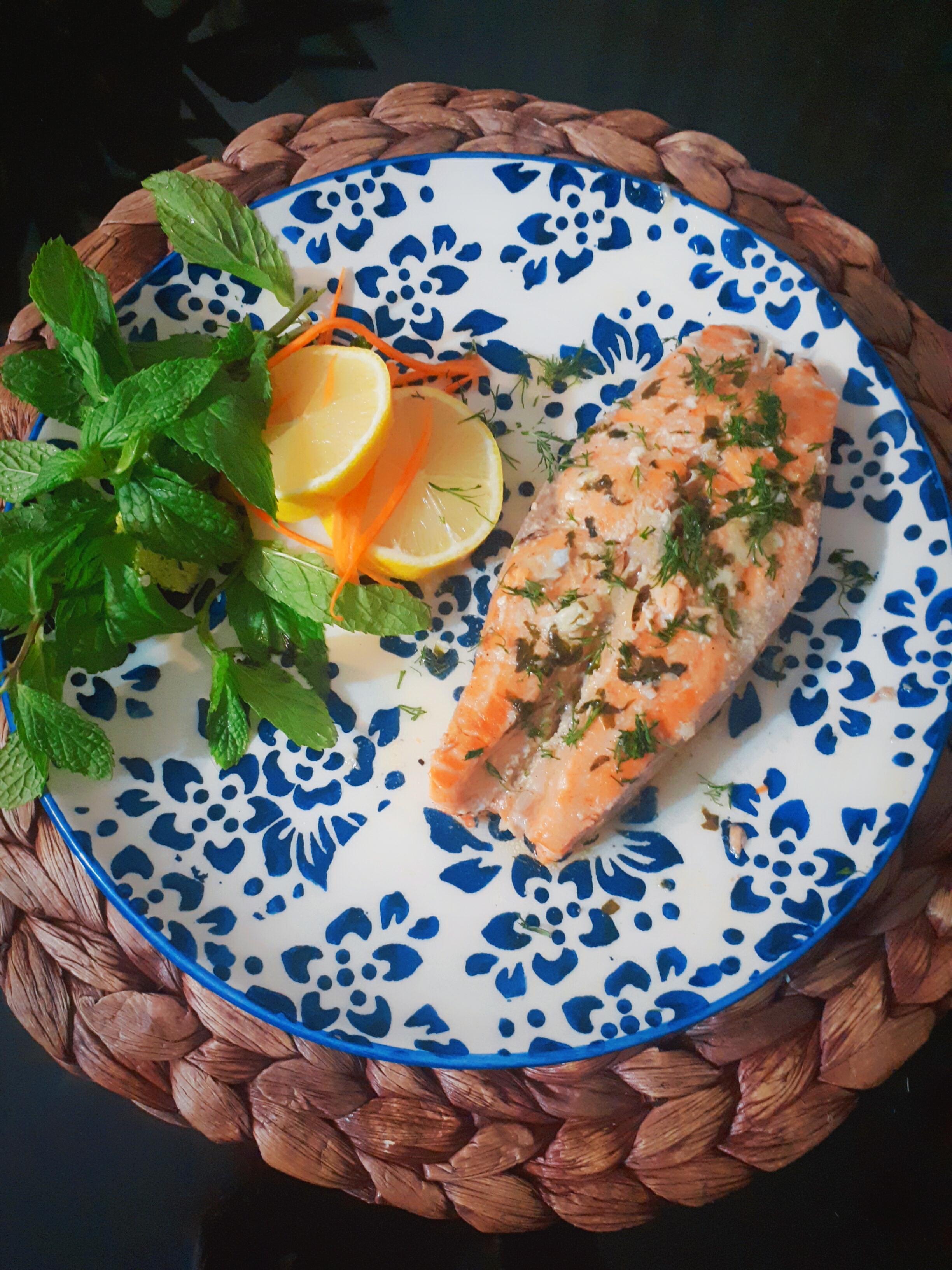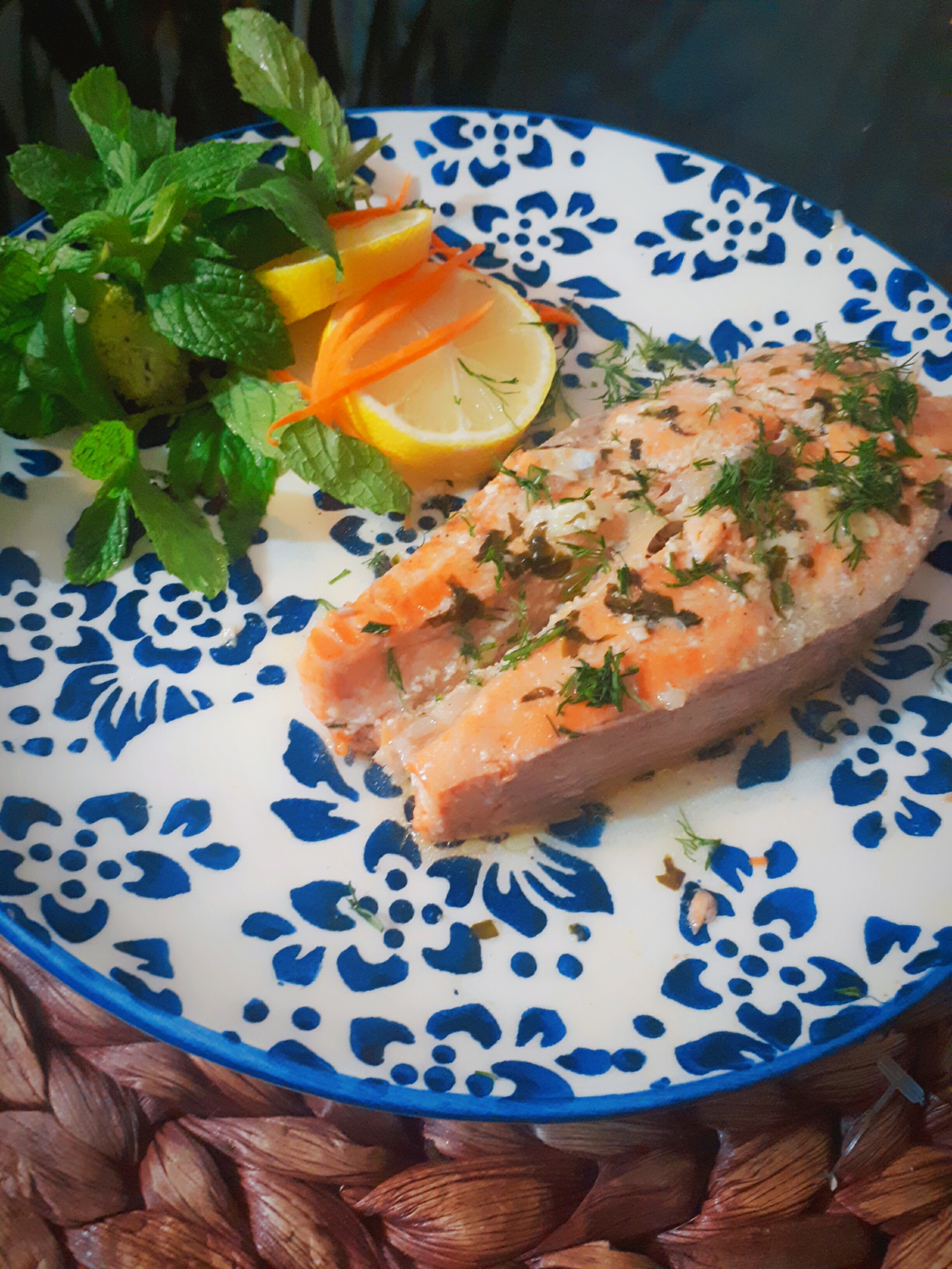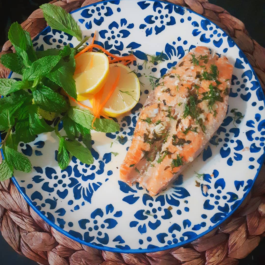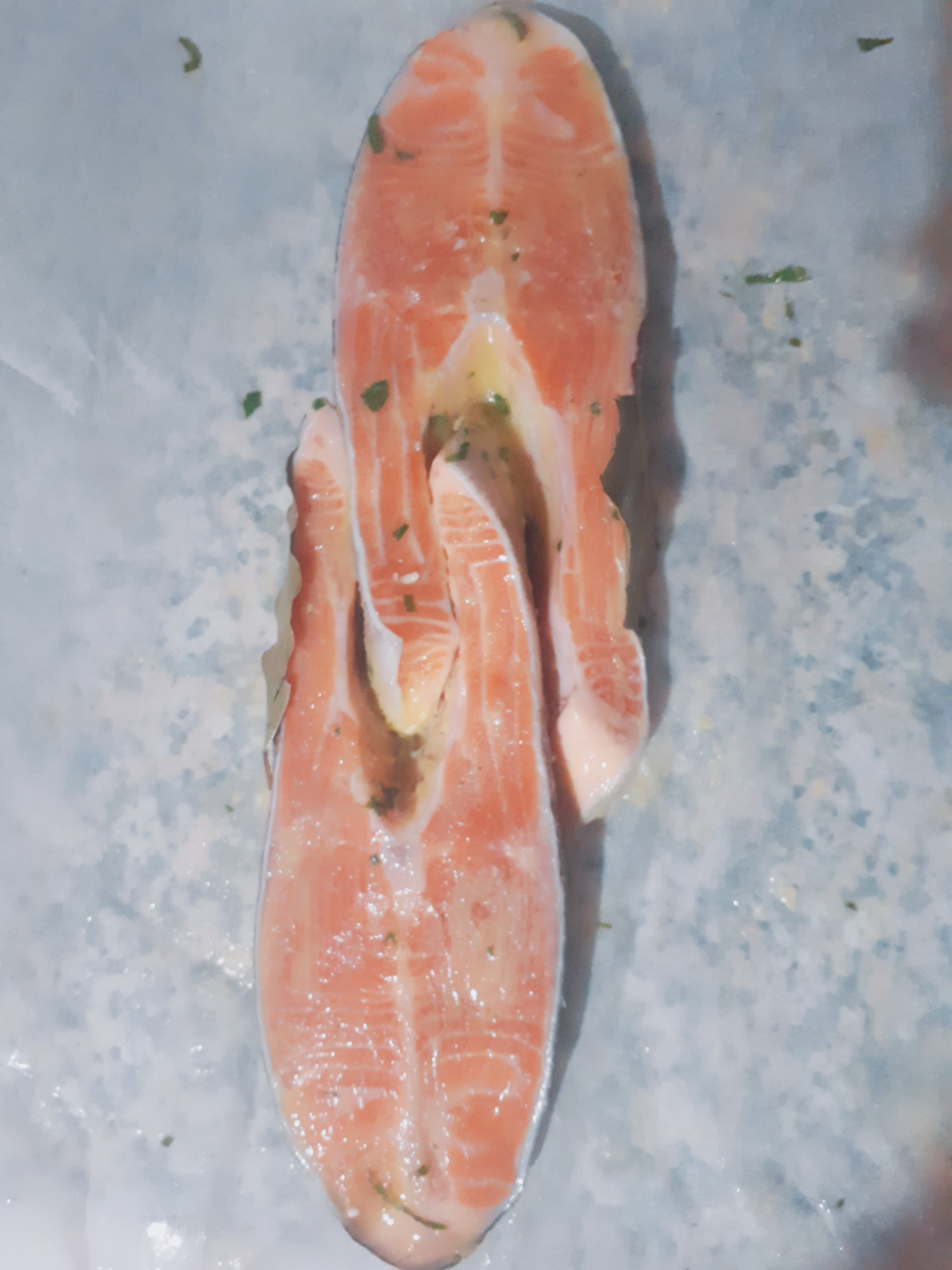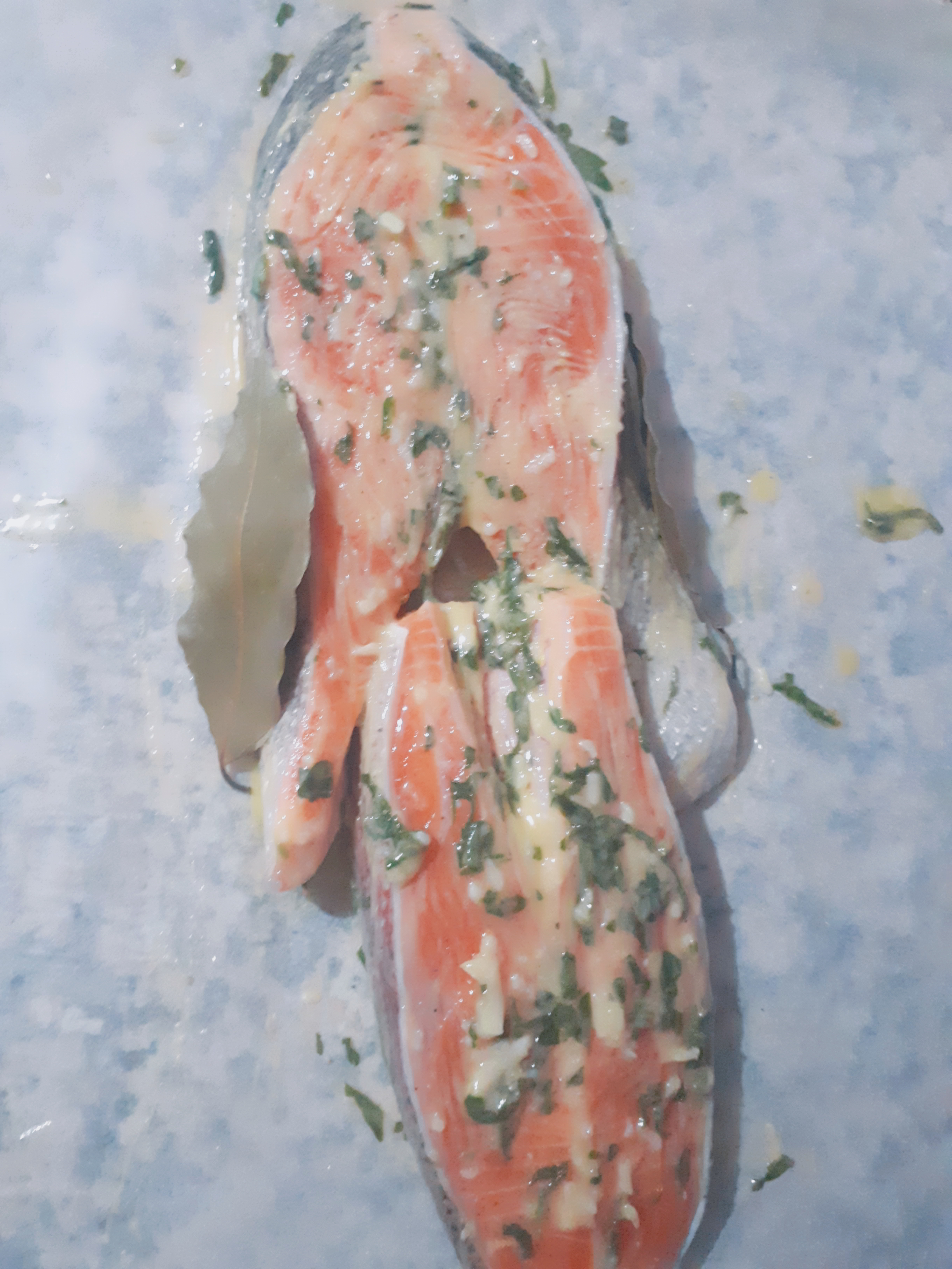 - Bir tavada tereyağını eritelim.Üzerine rendelenmiş sarımsak, maydanoz, sirke, tuz ve karabiberi döküp bir kaç kez karıştıralım.Yağlı kağıt uzerine iki somon bifteğini koyalım. Her tarafını soslayalım. Icerisine 2 tane defne yaprağı koyalım.Yağlı kağıt ile somonlari kaplayalim.Daha sonra folyo ile tekrar kaplayalım.Diğer somonlar icinde aynısını yapalım.Borcamın icerisine iki paketimizi yerlestirelim.Önceden 185° de ısıttıgımız fırında yaklaşık 25 dakika pisirelim.Pisen somonlarımızın uzerine ince kıyılmış dereotunu serpelim.
