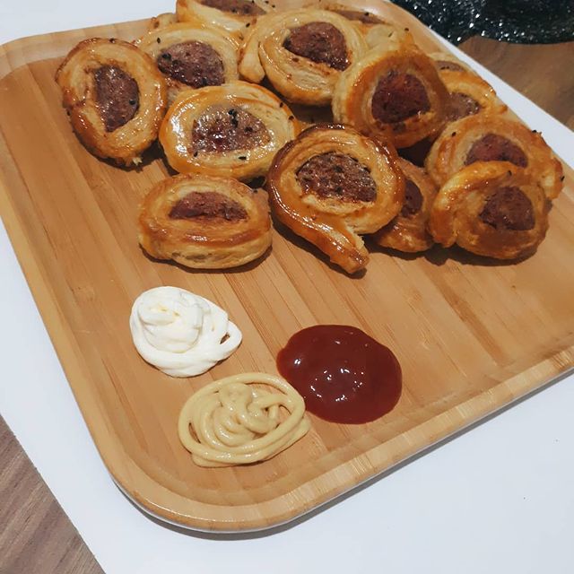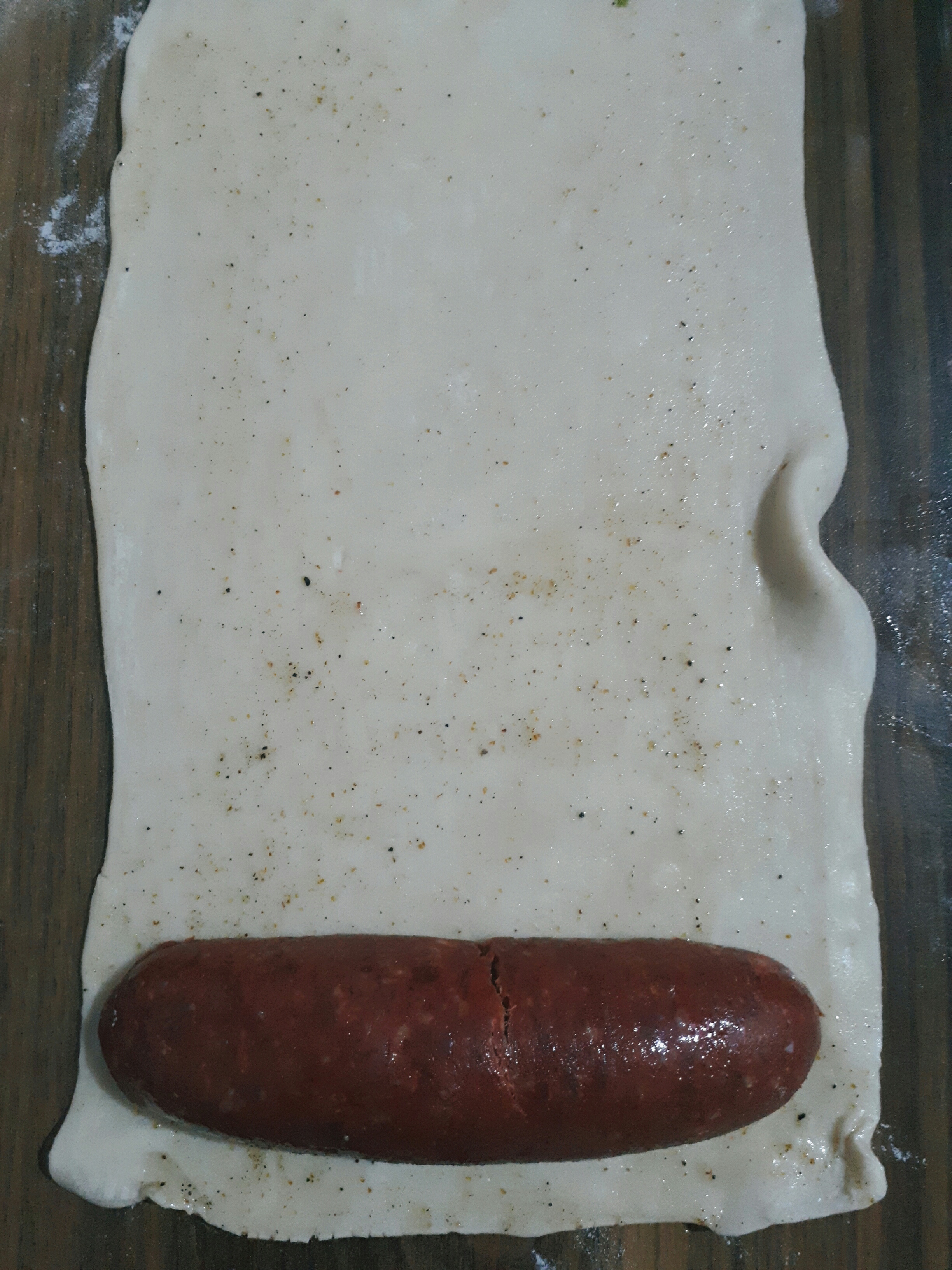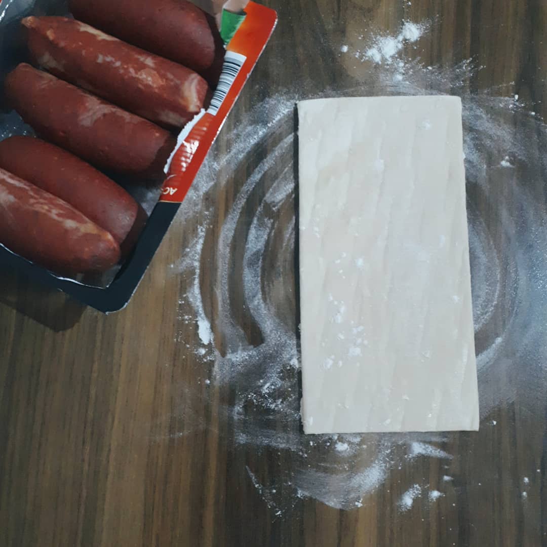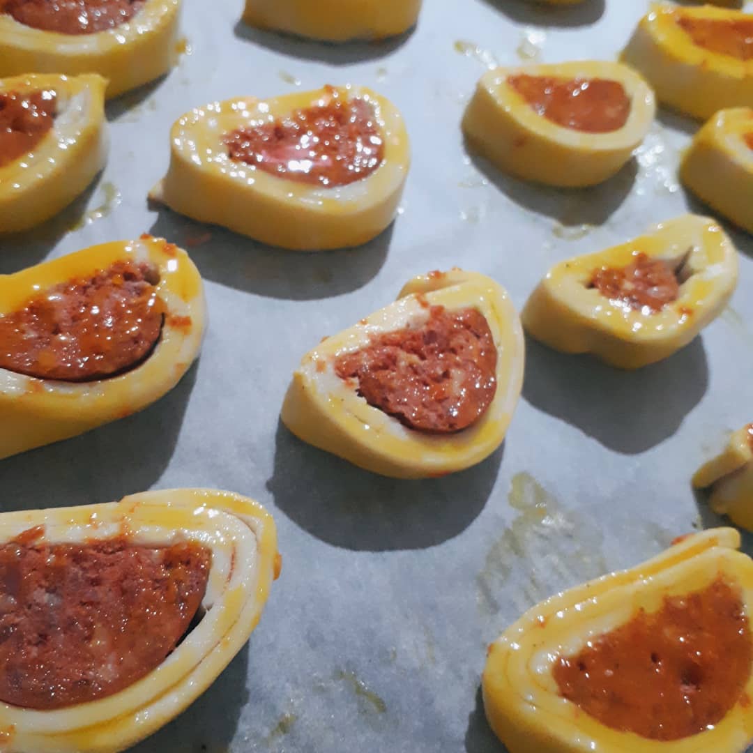 - Milföy hamurunu merdane yardımı ile sucuklarımızın boyutunda açalım. Parmak sucuklarımızı uzunlamasına ikiye bölelim. Milföy hamurunun üzerine hazırladığımız yağ, karabiber, kimyon karışımını sürelim. Milföy hamuru ile sucuğu saralım ve istediğimiz boyutlarda keselim.