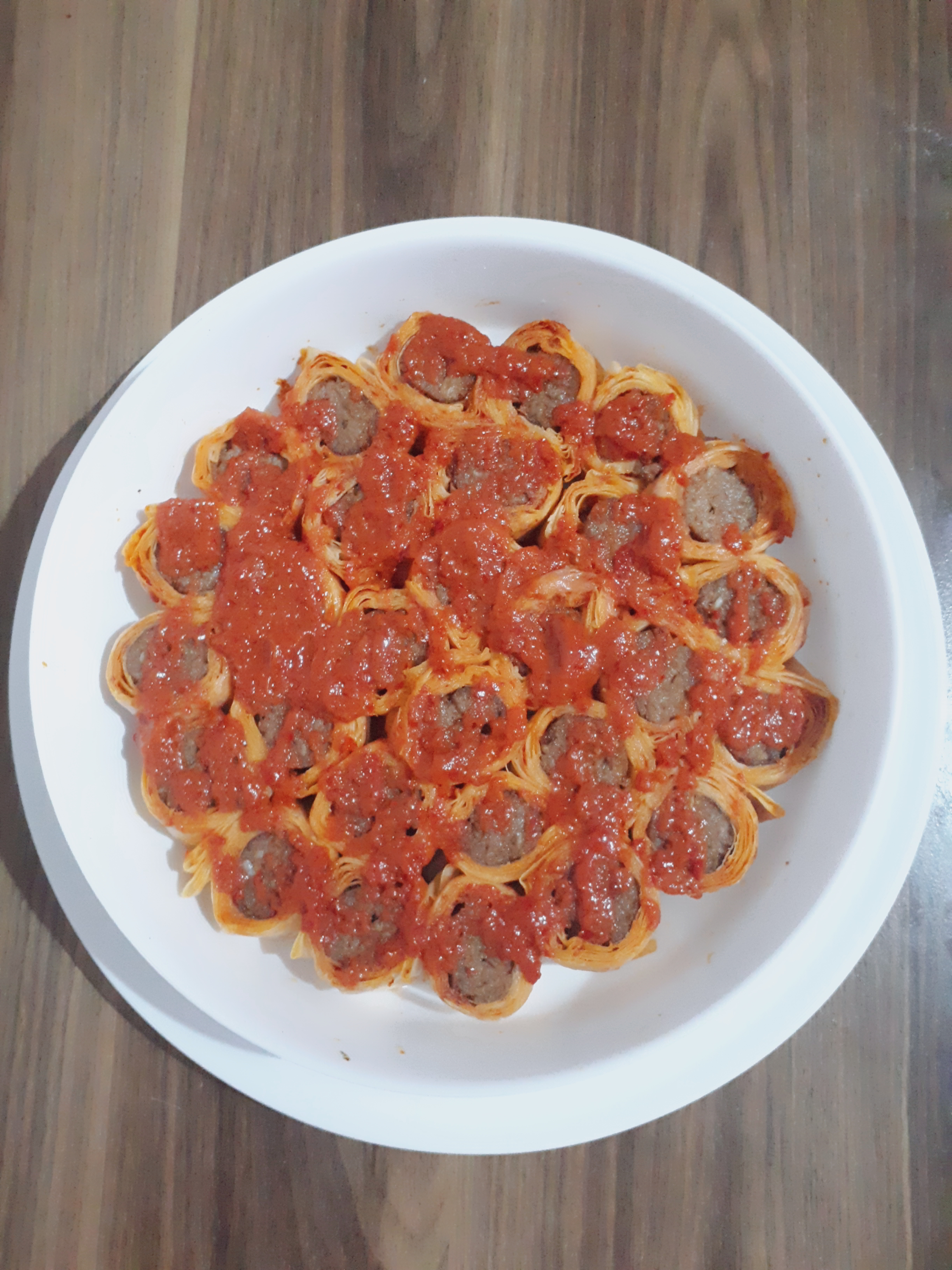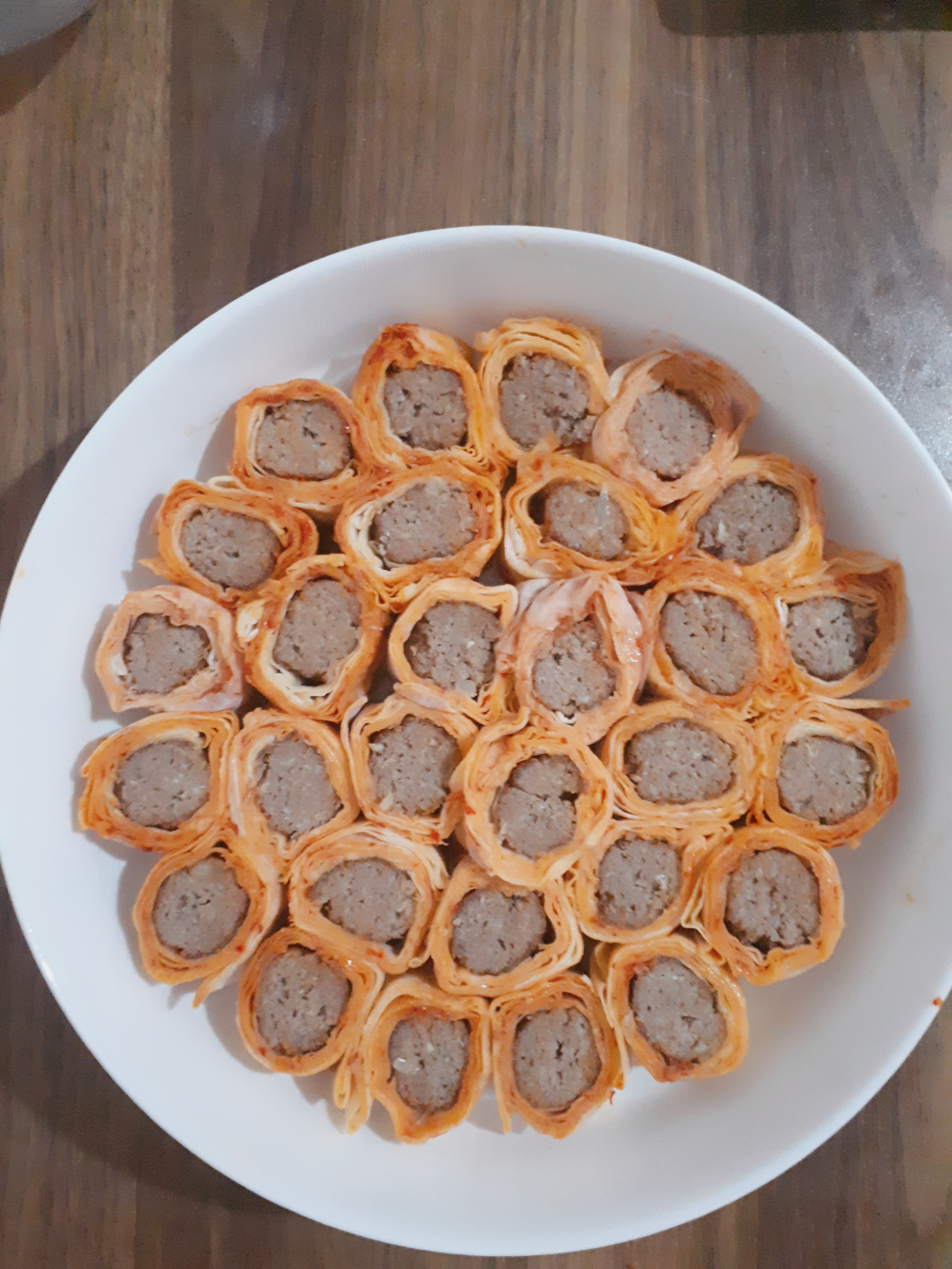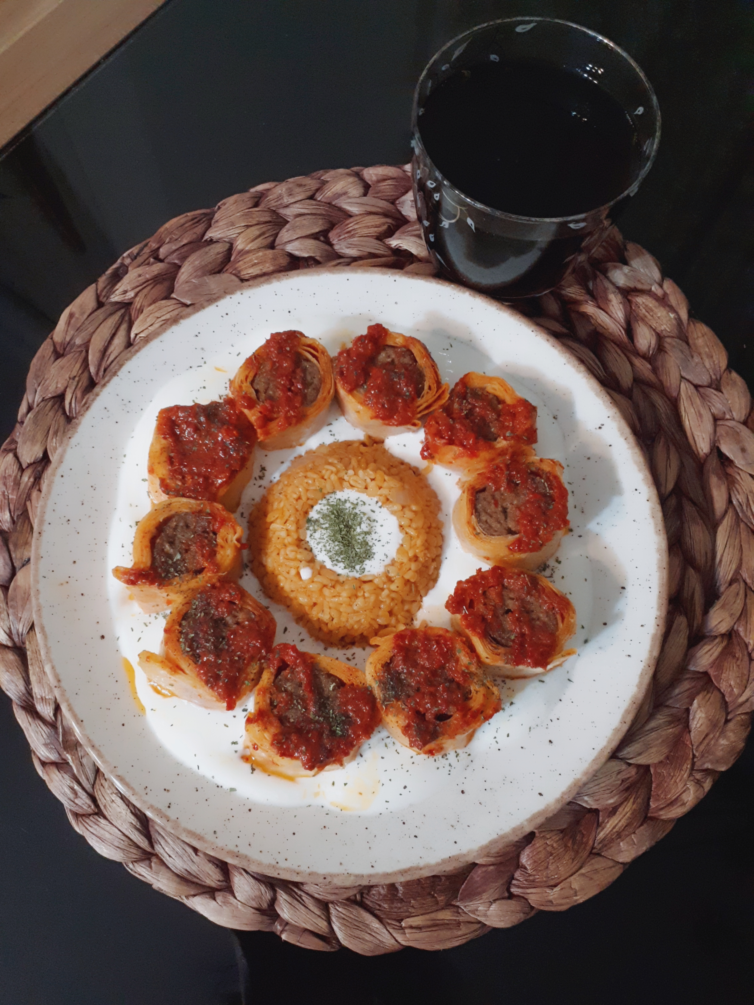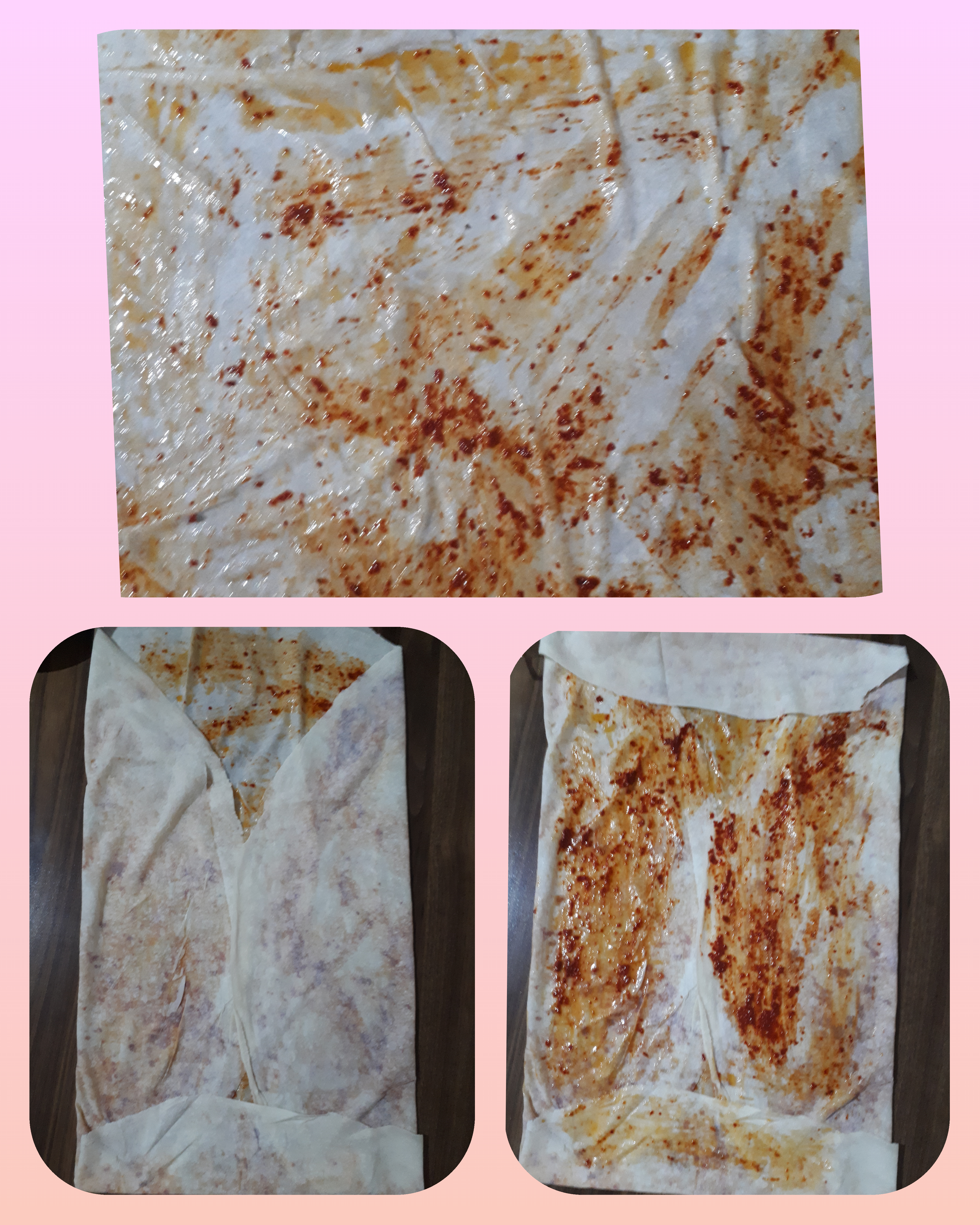 - Bir yufka açılır ve üzerine hazırlanan sostan sürülür. Karşılıklı iki ucu ortada birleştirilir. Kuru yerlere sos sürülür.