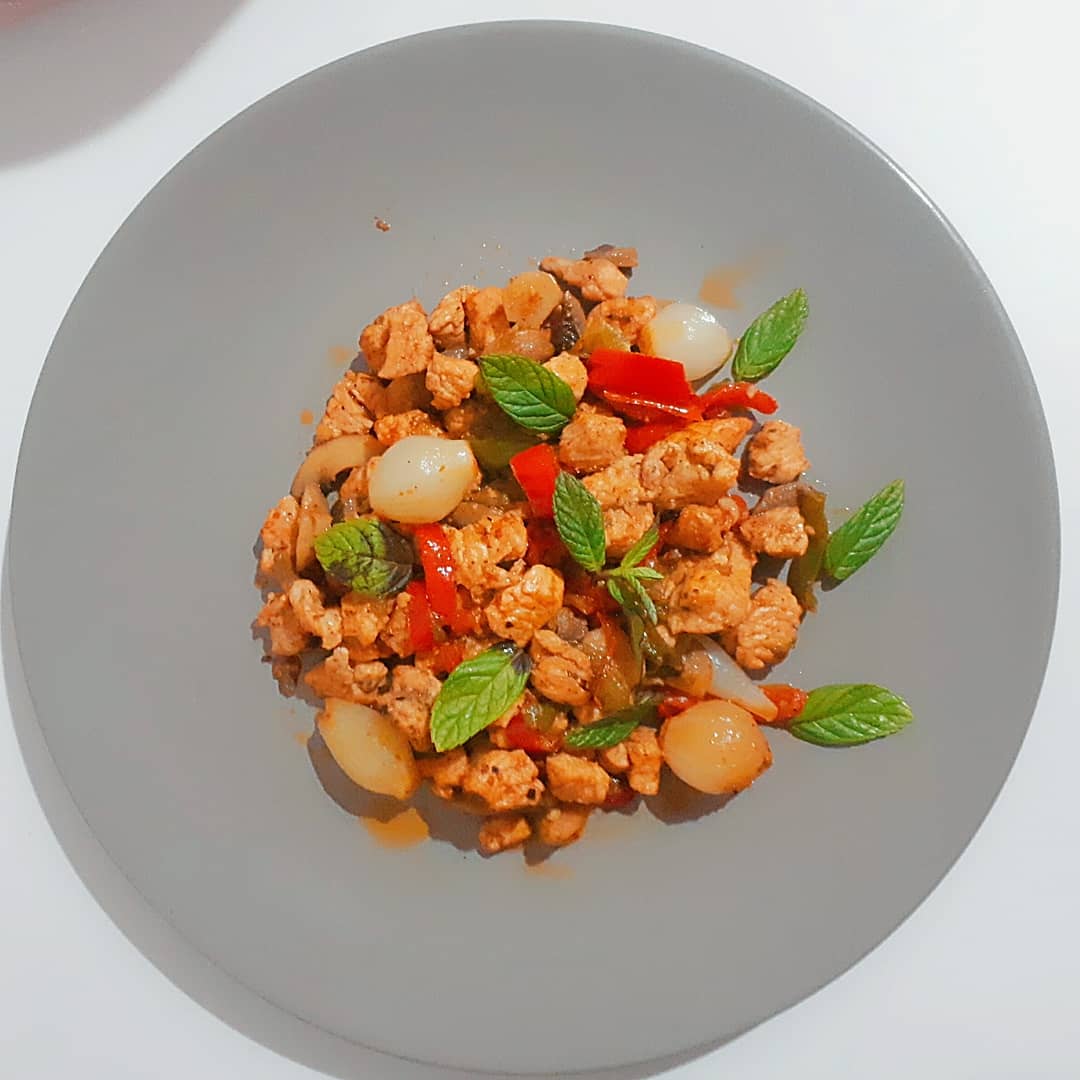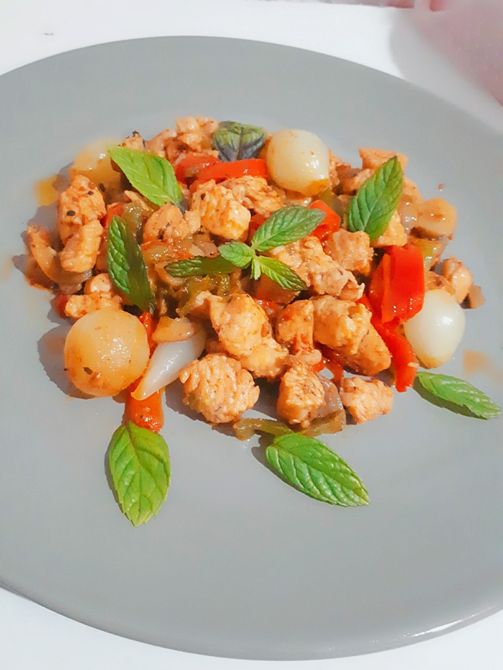 - Hindi eti ufak ufak doğranır. Tavaya alınır ve kavrulur.