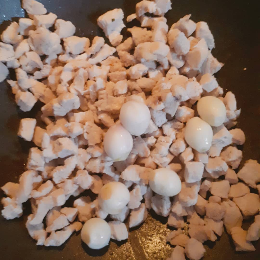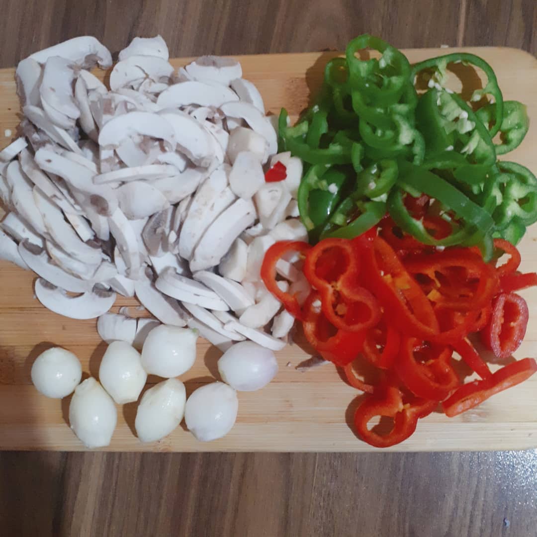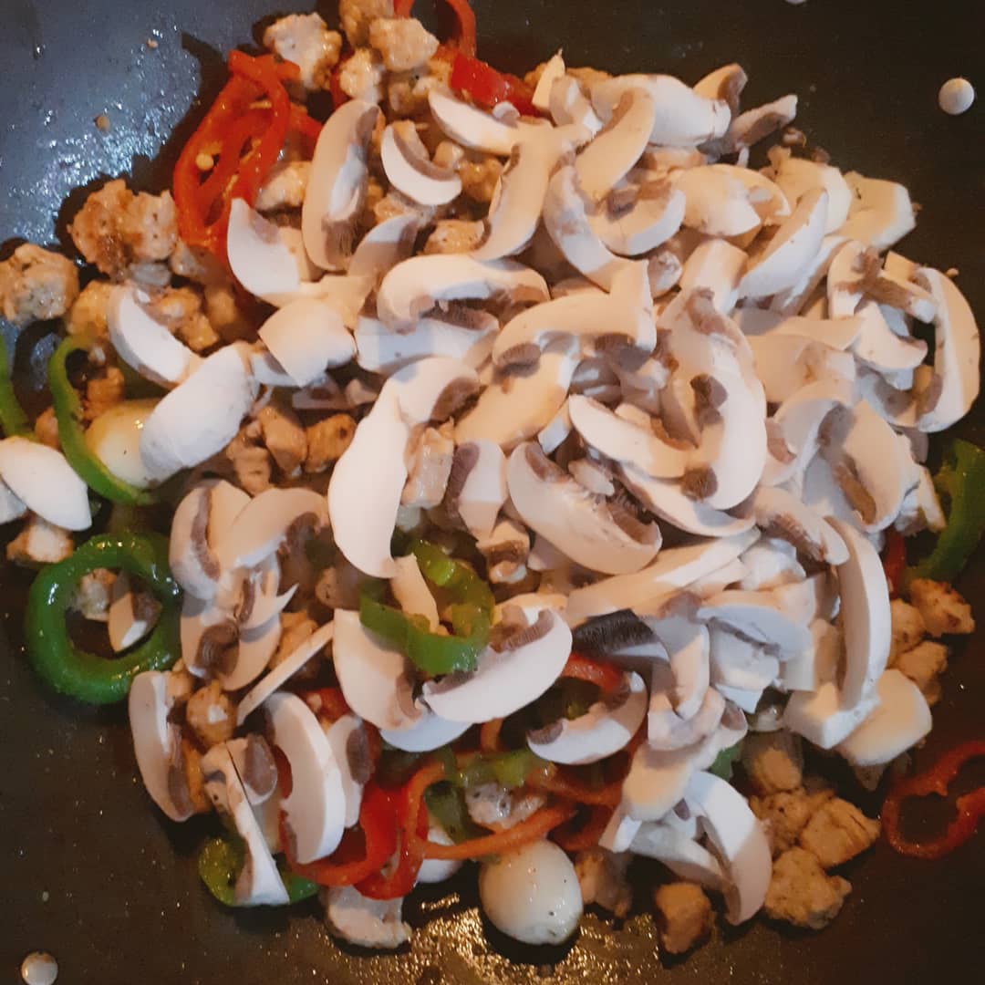 - Suyunu çektikten sonra sıvıyağ eklenir ve sırasıyla soğan, biber kavrulur ve mantar eklenir.