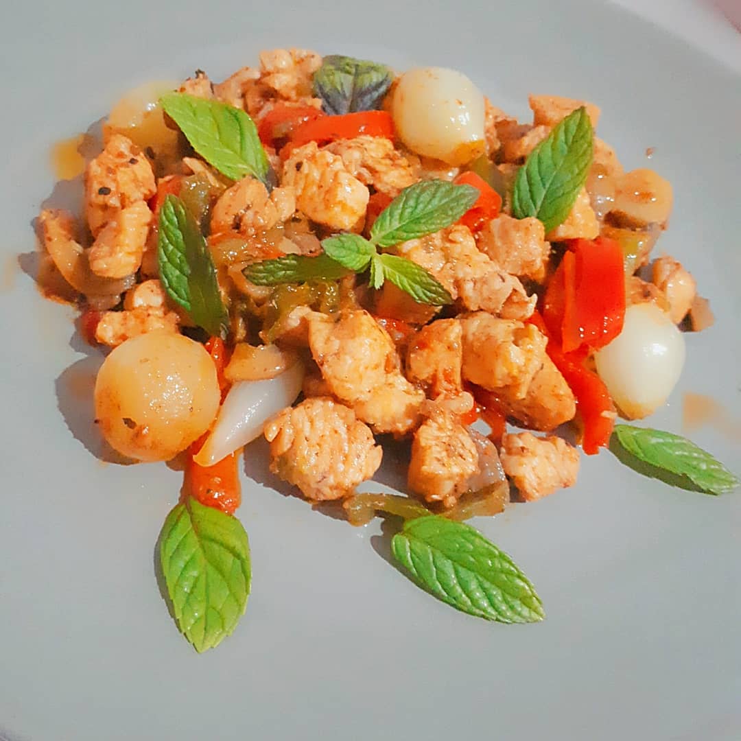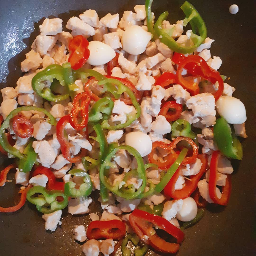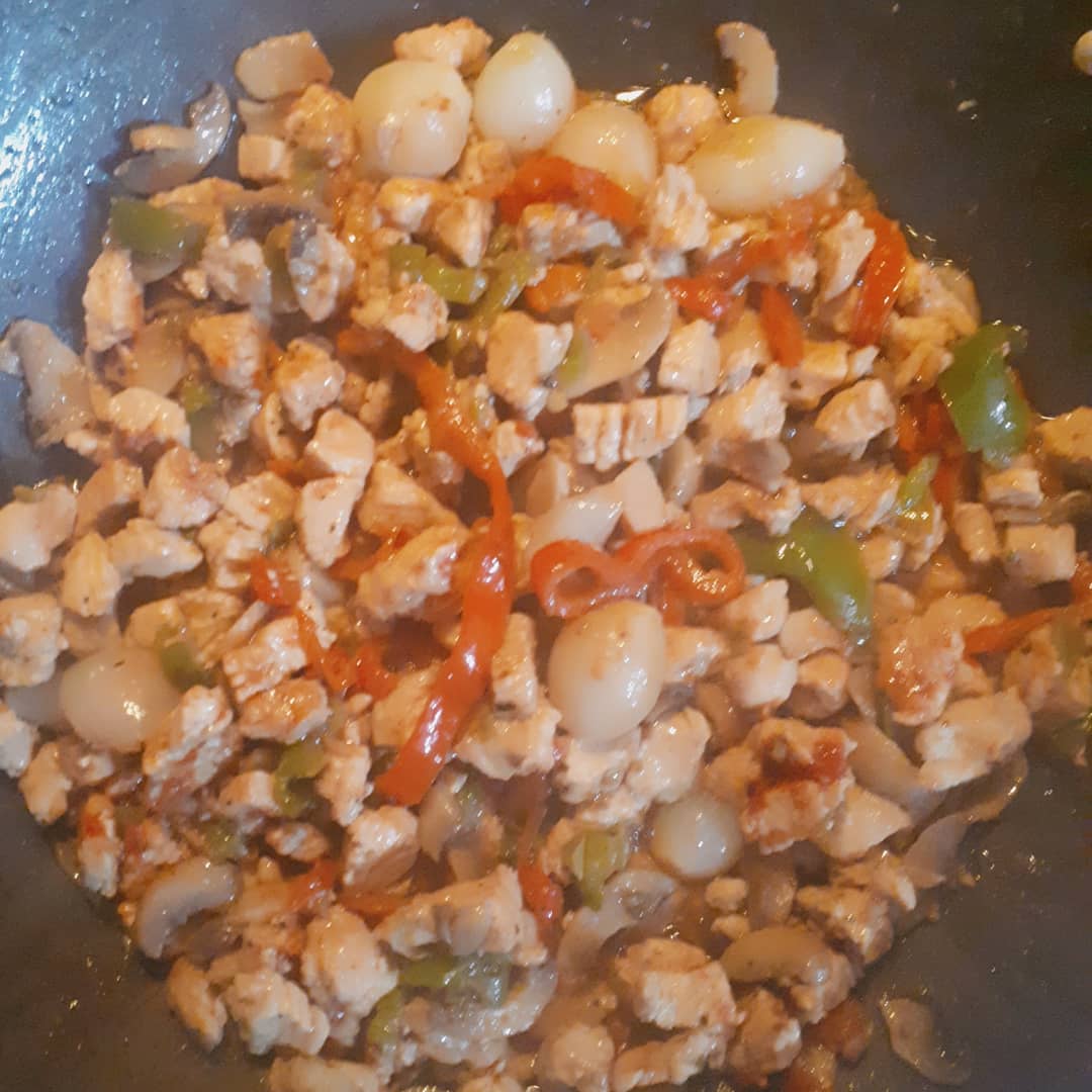 - Suyunu çektikten sonra sıvıyağ eklenir ve sırasıyla soğan, biber kavrulur ve mantar eklenir.
