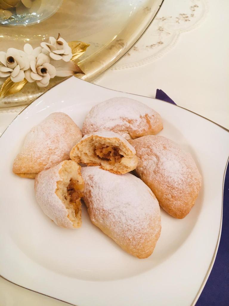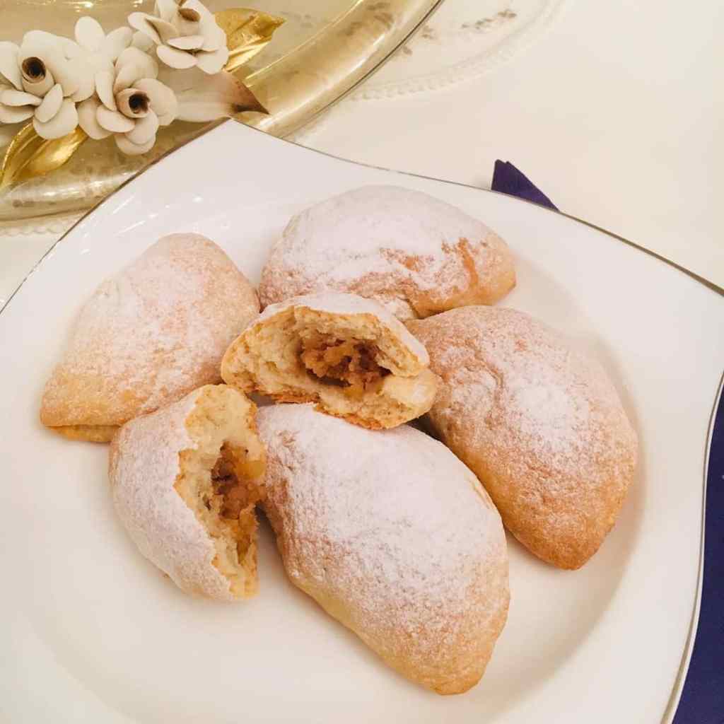 - Hamurdan eşit parçalar alınarak içerisine elma harcı koyulur ve kapatılır.