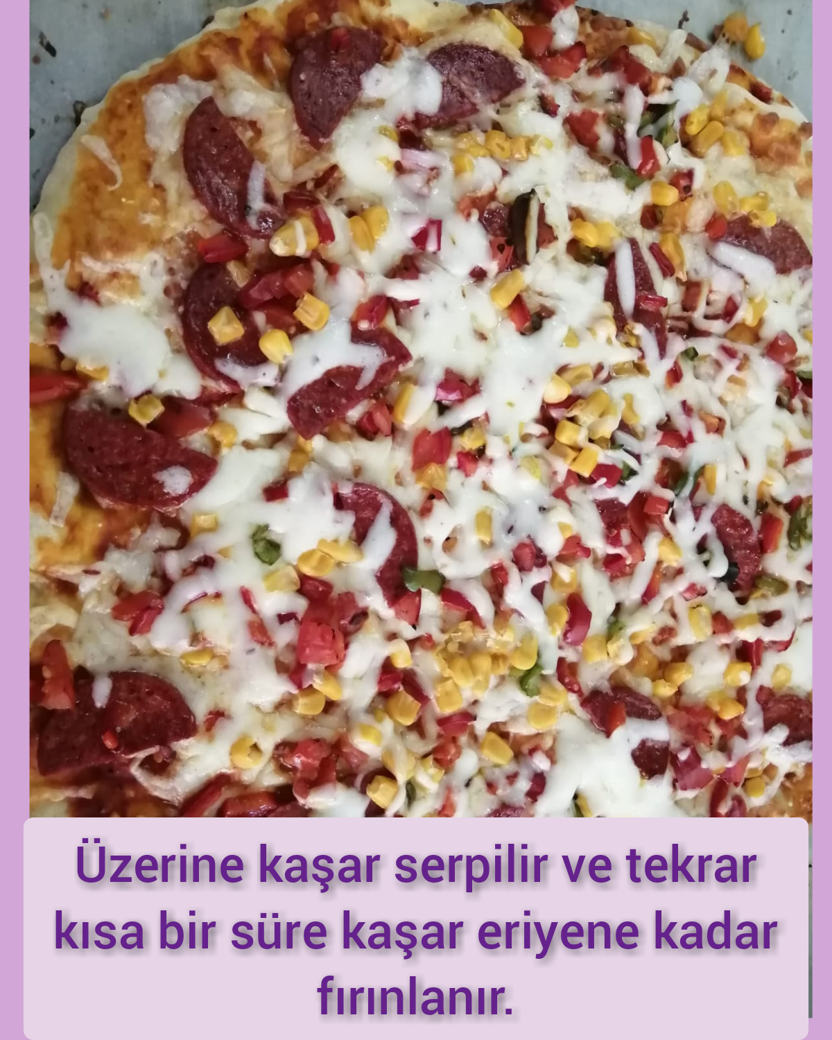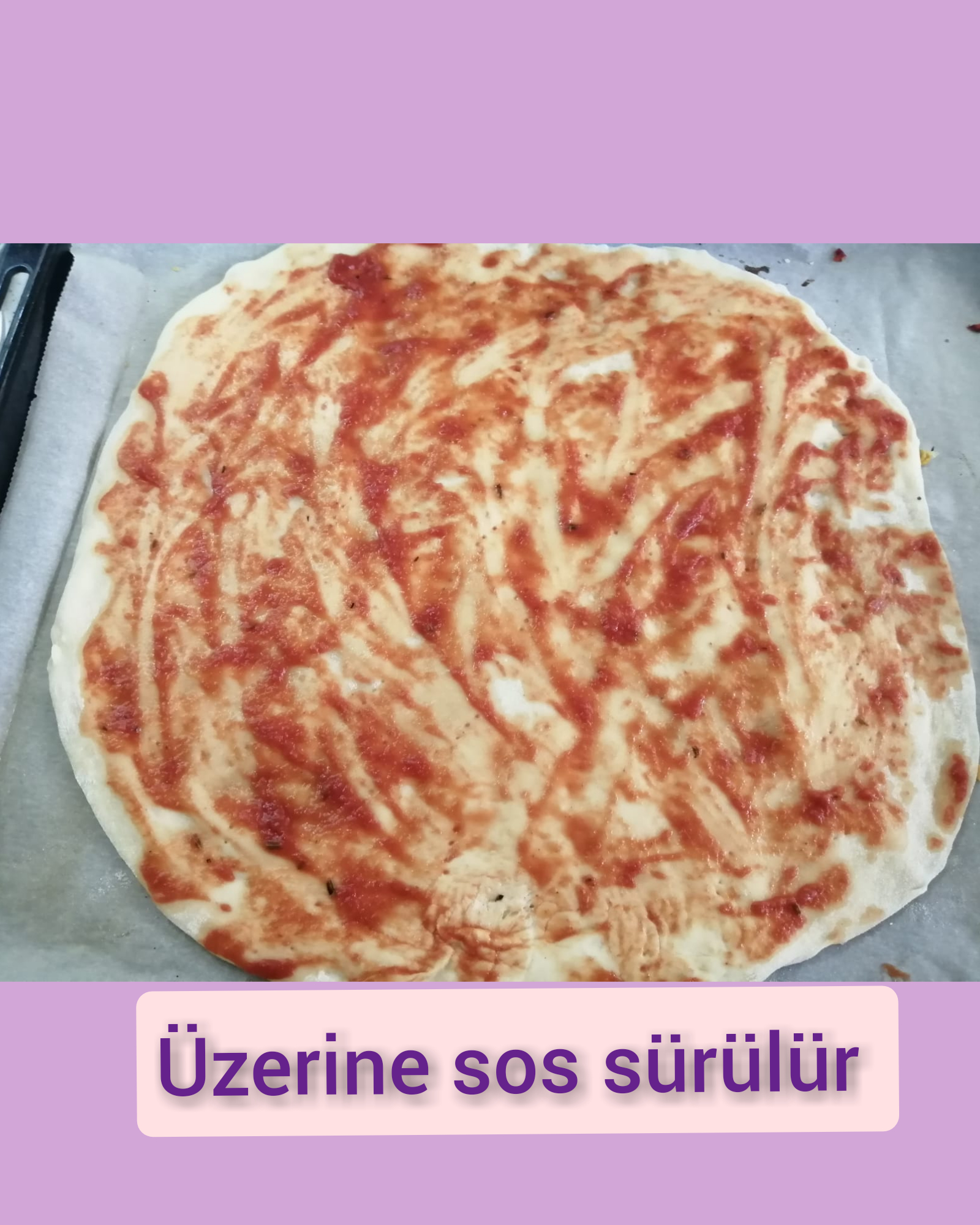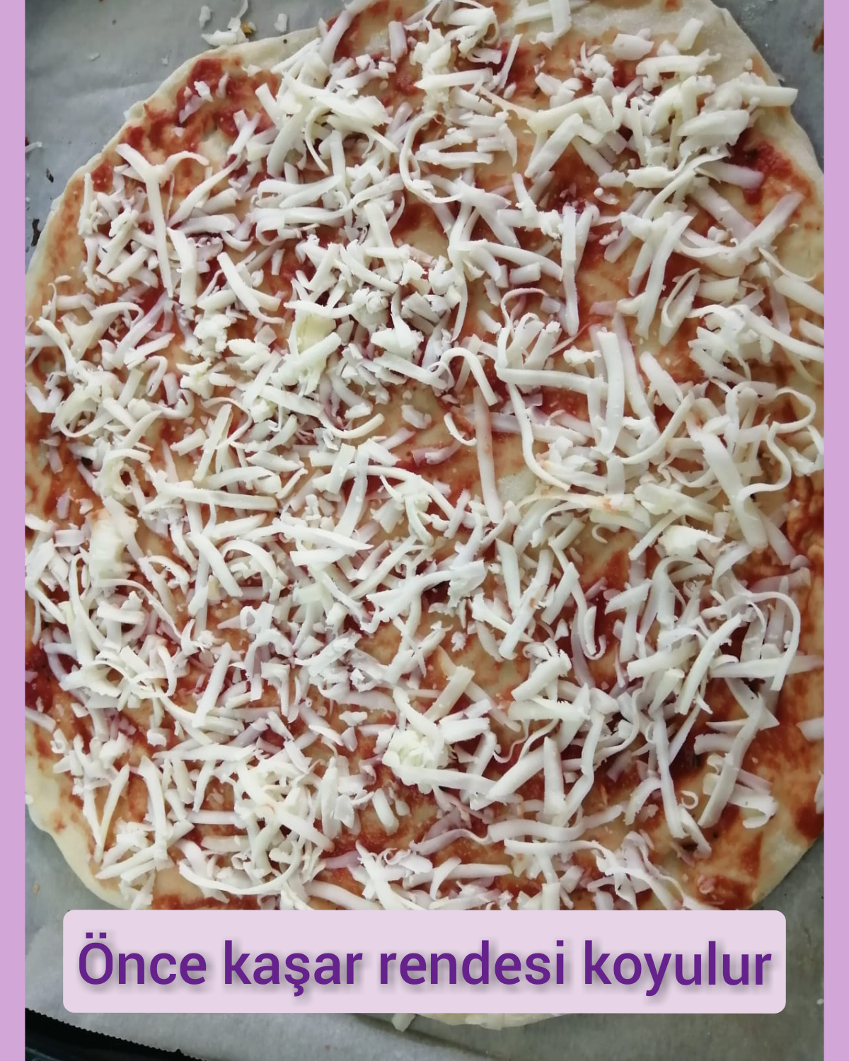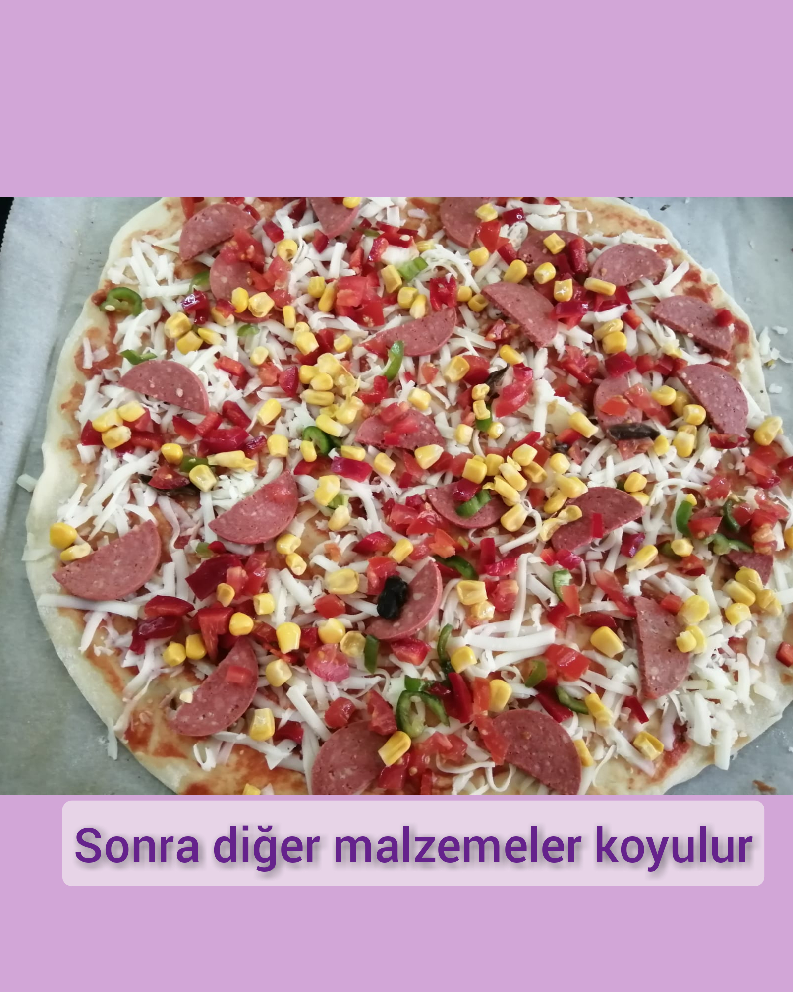 - Daha sonra üzerine sosu sürülür. Kaşar serpilir ve tüm malzemeler eklenir.