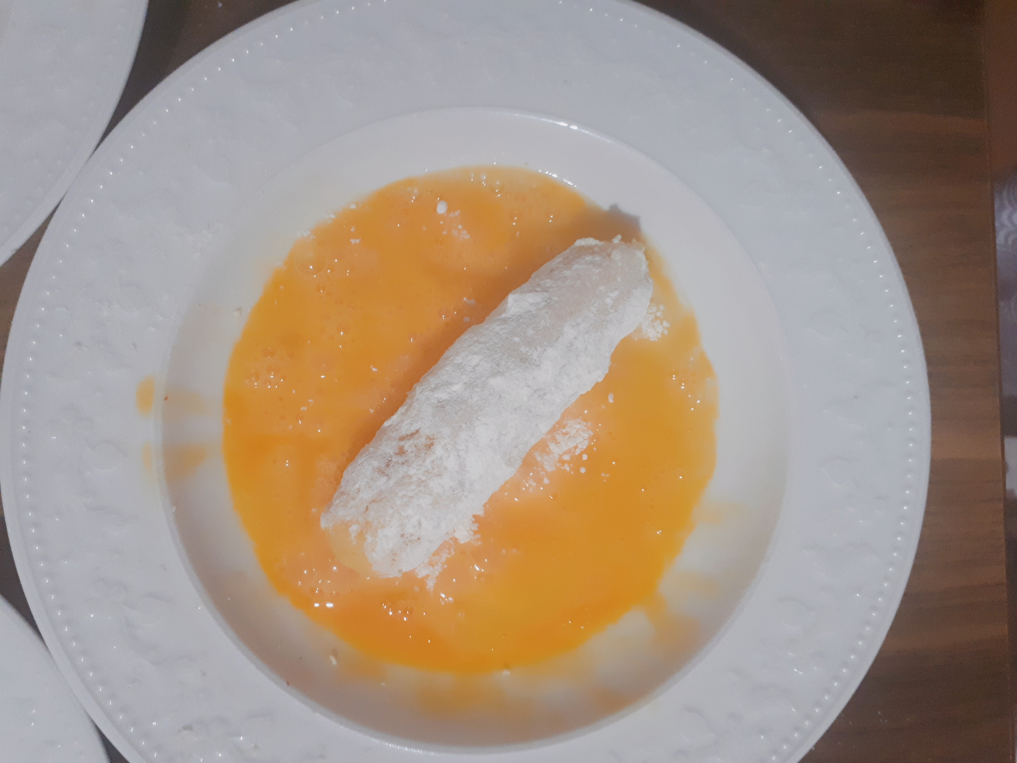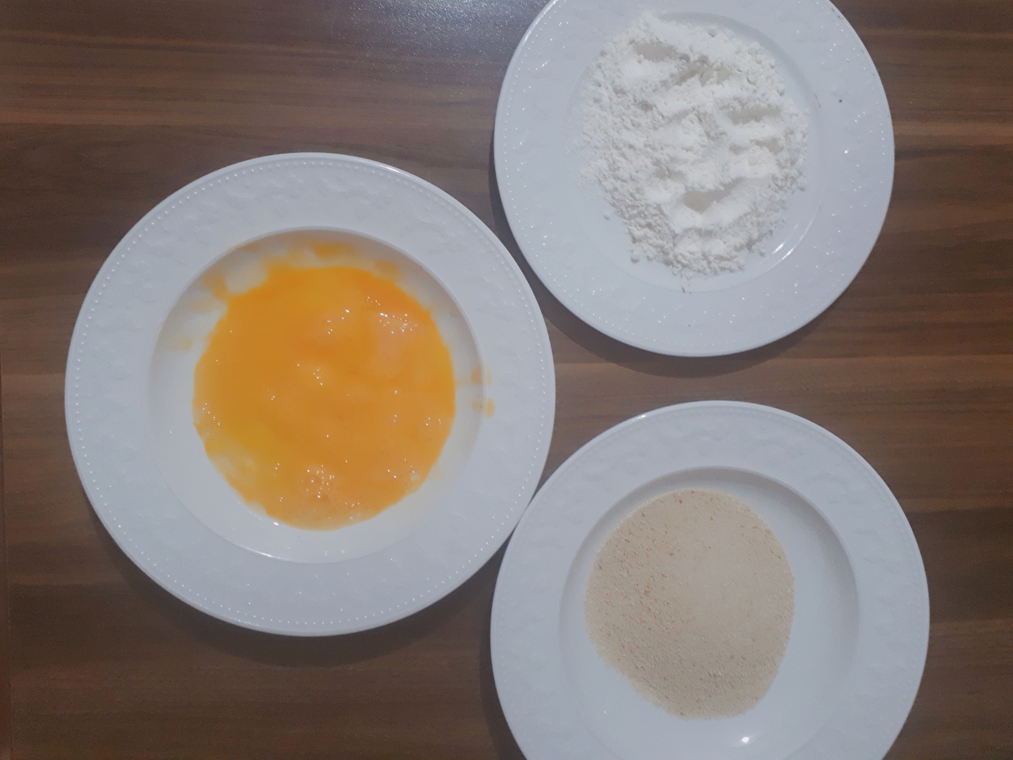 - Üç ayrı kapta beyaz un, galeta unu ve yumurtayı koyun.