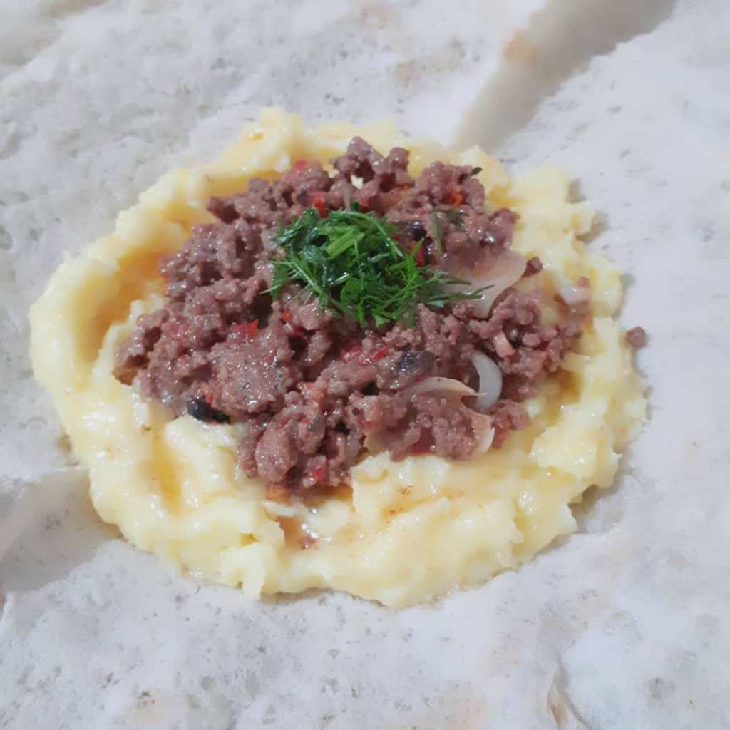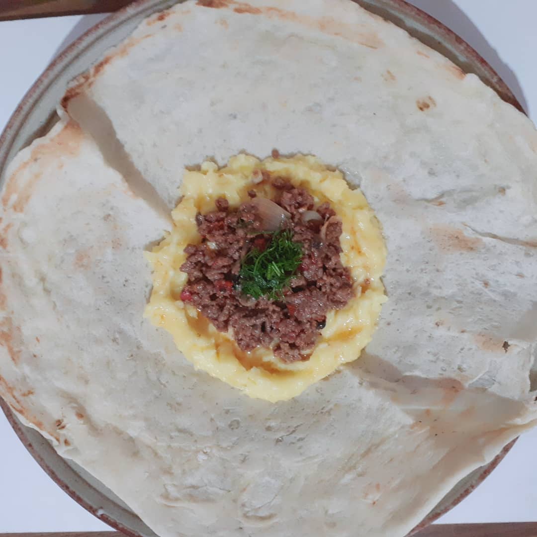 Hazır aldığım lavaşları fırında biraz ısıttıktan sonra tabağa aldım ve ortasına patates püresi, onun üstüne de kıymayı koyduktan sonra üzerini lavaşla kapattım ve servise hazır.