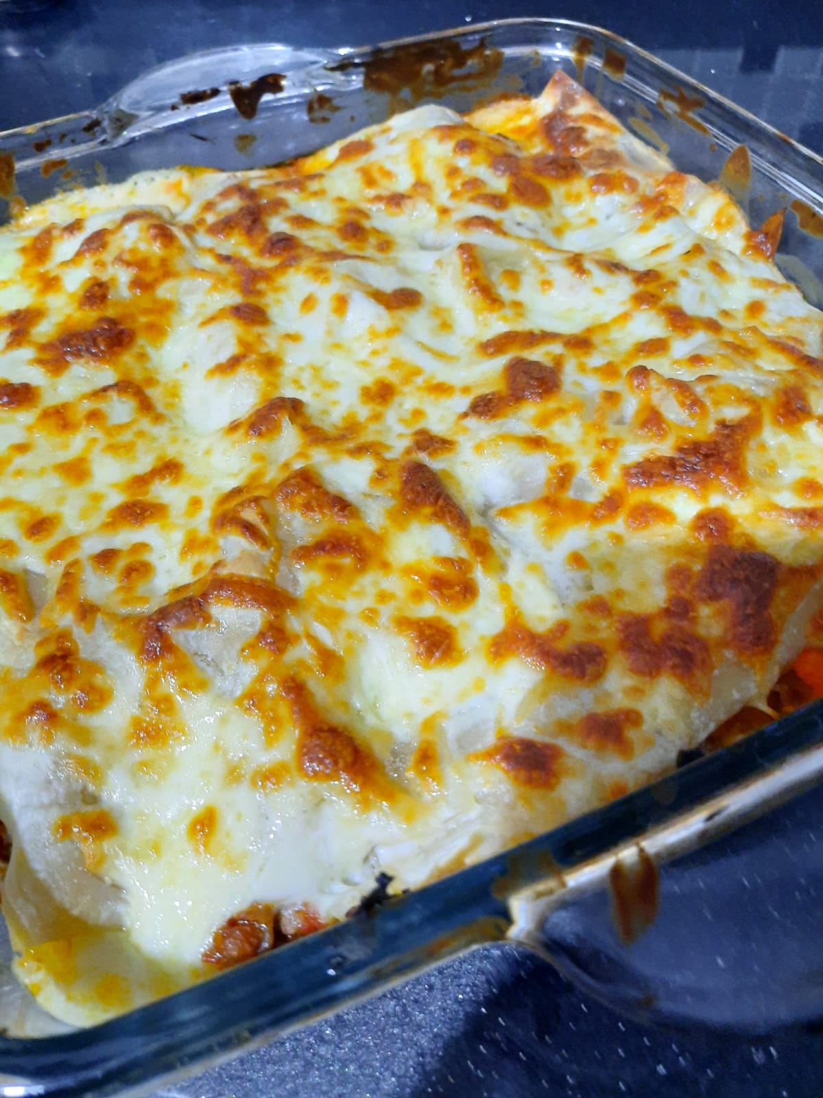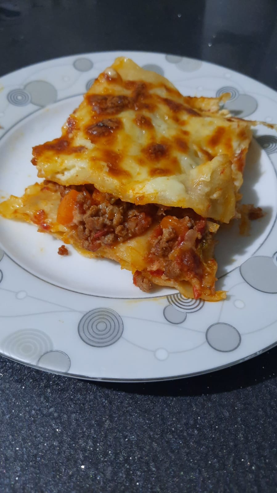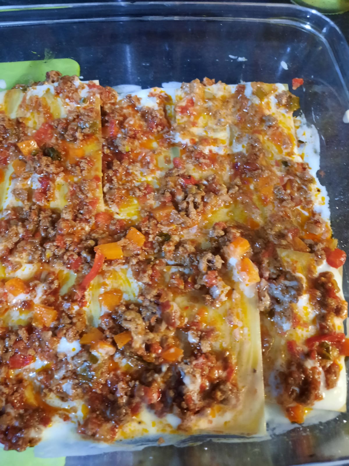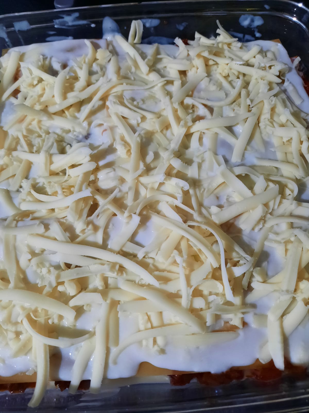 - Üzerine tekrar besamel sos onun üstüne de bolonez sostan döküp yayalım. Malzememiz bitene kadar bu islemi tekrarlayalım.Tarifte 4 kat yapıldı. En üst katı dizdikten sonra üstüne beşamel sos ve rendelenmiş kaşar peyniri serpip fırında pişiriyoruz.