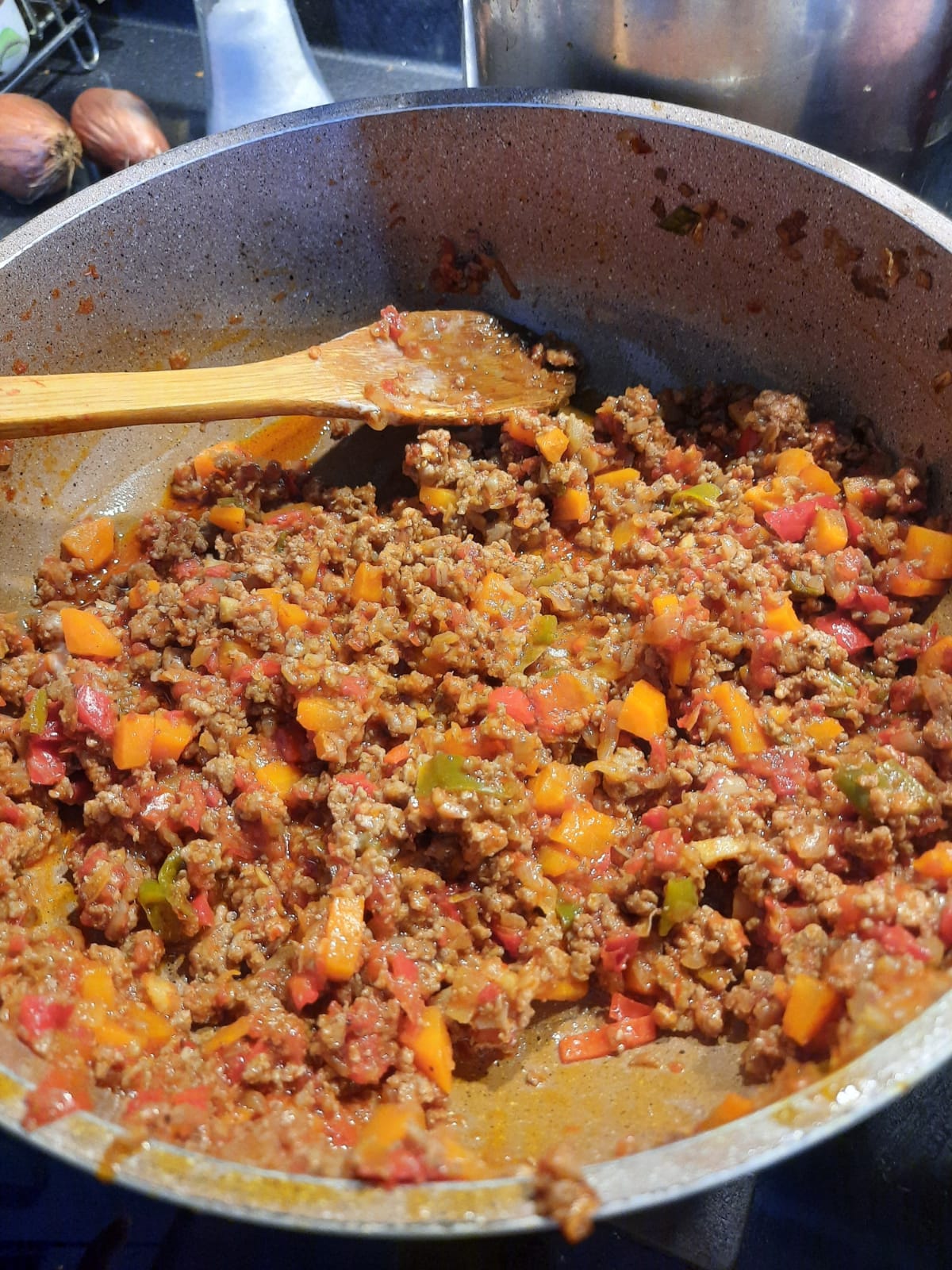 - Önce yağda soğanlar biberler kavrulur Ardındansarimsak ve havuc eklenir. Havuçlar biraz yumuşayınca salça eklenip biraz çevrildikten sonra domates sos tuz ve karabiber de eklenir.