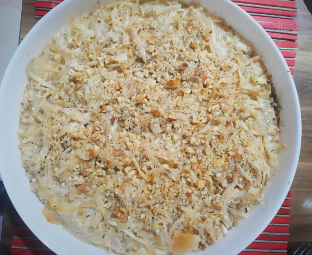 - En üst kata bol tavuk eti, ceviz ve tereyağını elleyip 175 °önceden ısıtılmış fırında uzerindeki tavuklar kızarana kadar yaklaşık 10 dk pişirelim.