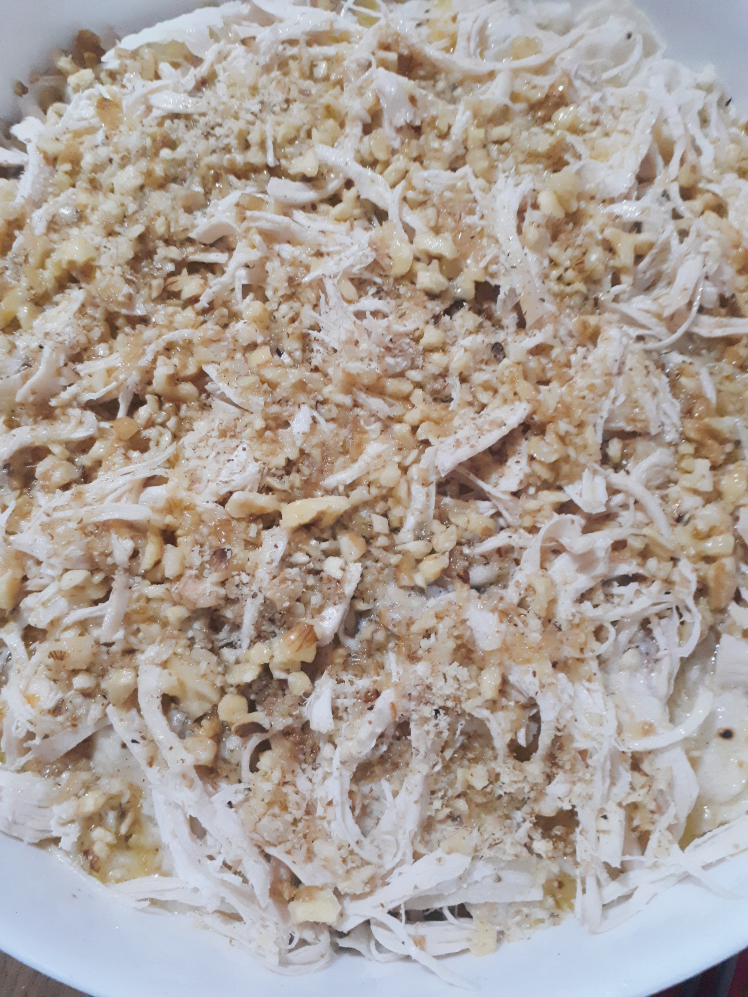 - Üzerine sırasıyla her kata yetecek şekilde tavuk eti, ceviz koyalım.Tekrar yufka koyalım, ıslatalım ve bu sekilde fırın kabı dolana kadar aynı islemi tekrarlayalım.İkinci kattan itibaren ayrıca tereyağıda gezdirelim.