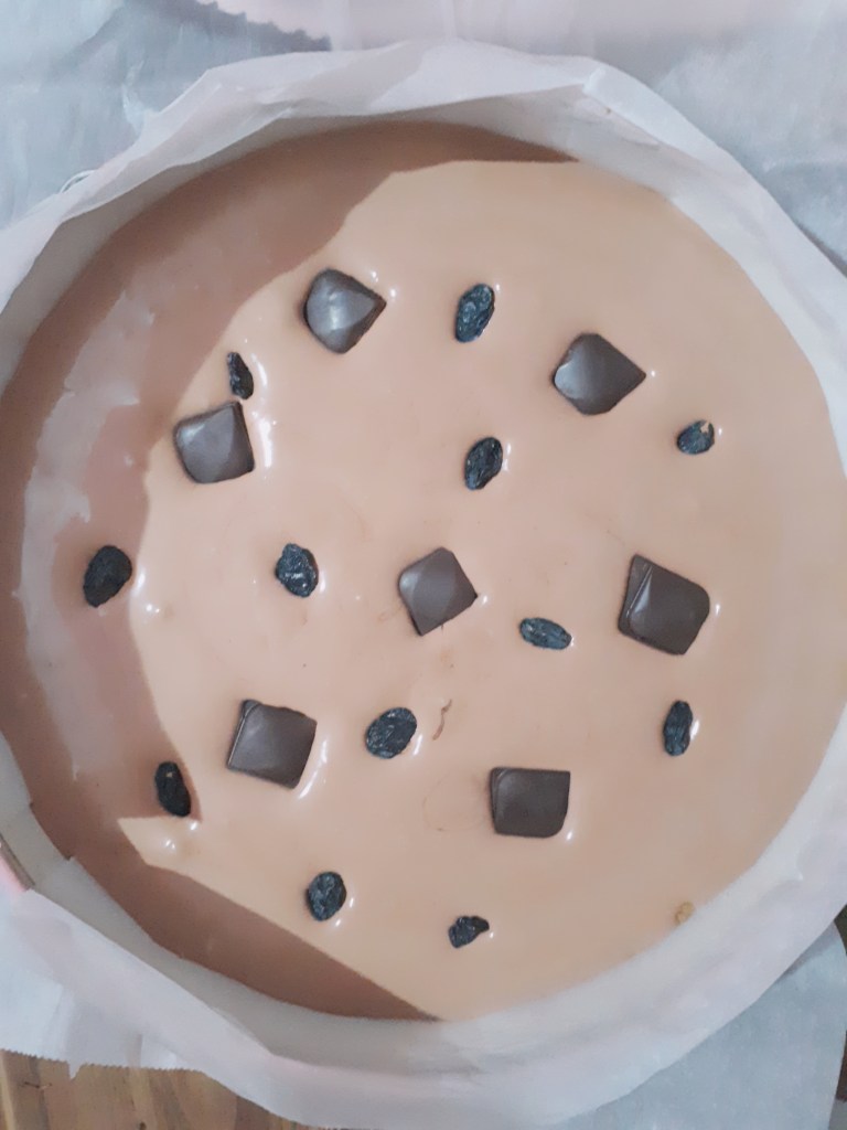 - Karışımı kelepçeli kalıbımıza dökelim. Üzerine belli aralıklarla yarım paket bitter cikolatayi kare olacak sekilde serpelim.