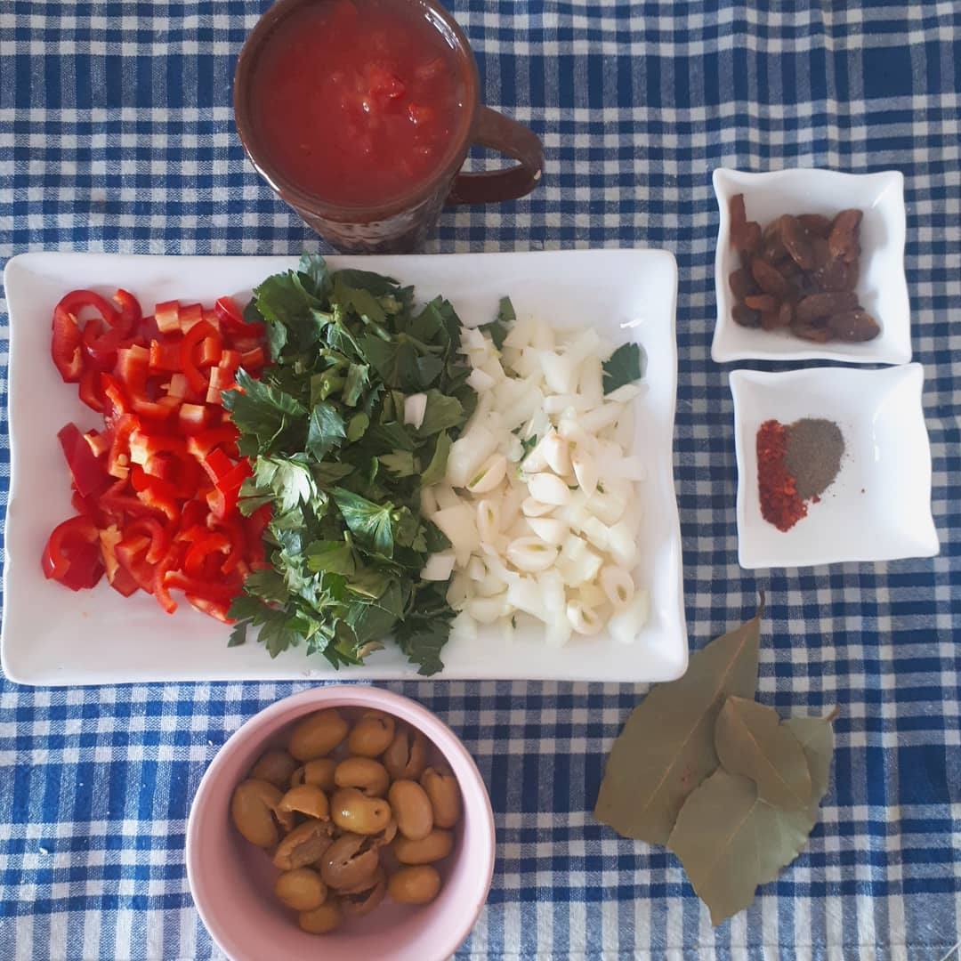 • Sırasıyla yesil zeytin, kuru üzüm, sirke, defne yaprağı eklendikten sonra suyunu çekmesi beklenir.