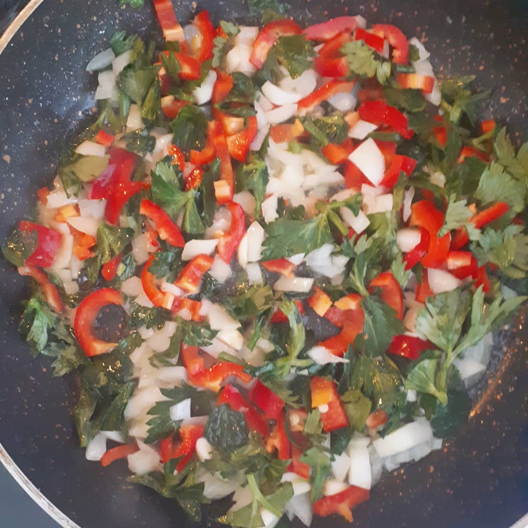 • Biber, kereviz ve sapı, soğan ve sarımsak doğranır ve tavaya eklenir.