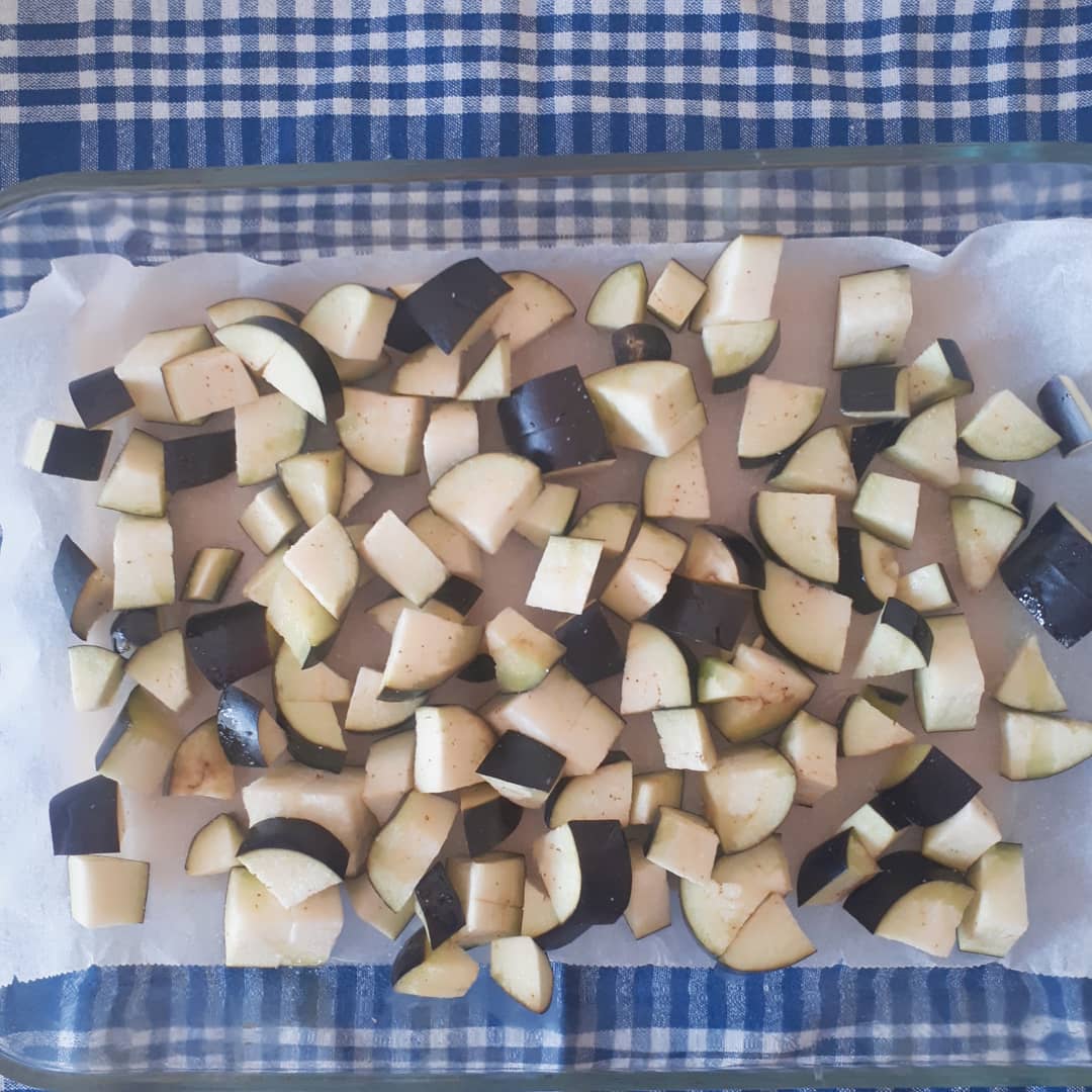 • Patlıcanları küp küp kesilir.Zeytinyagi ve tuz ile ovulur.200 ° fırında kızarana kadar pişirilir.