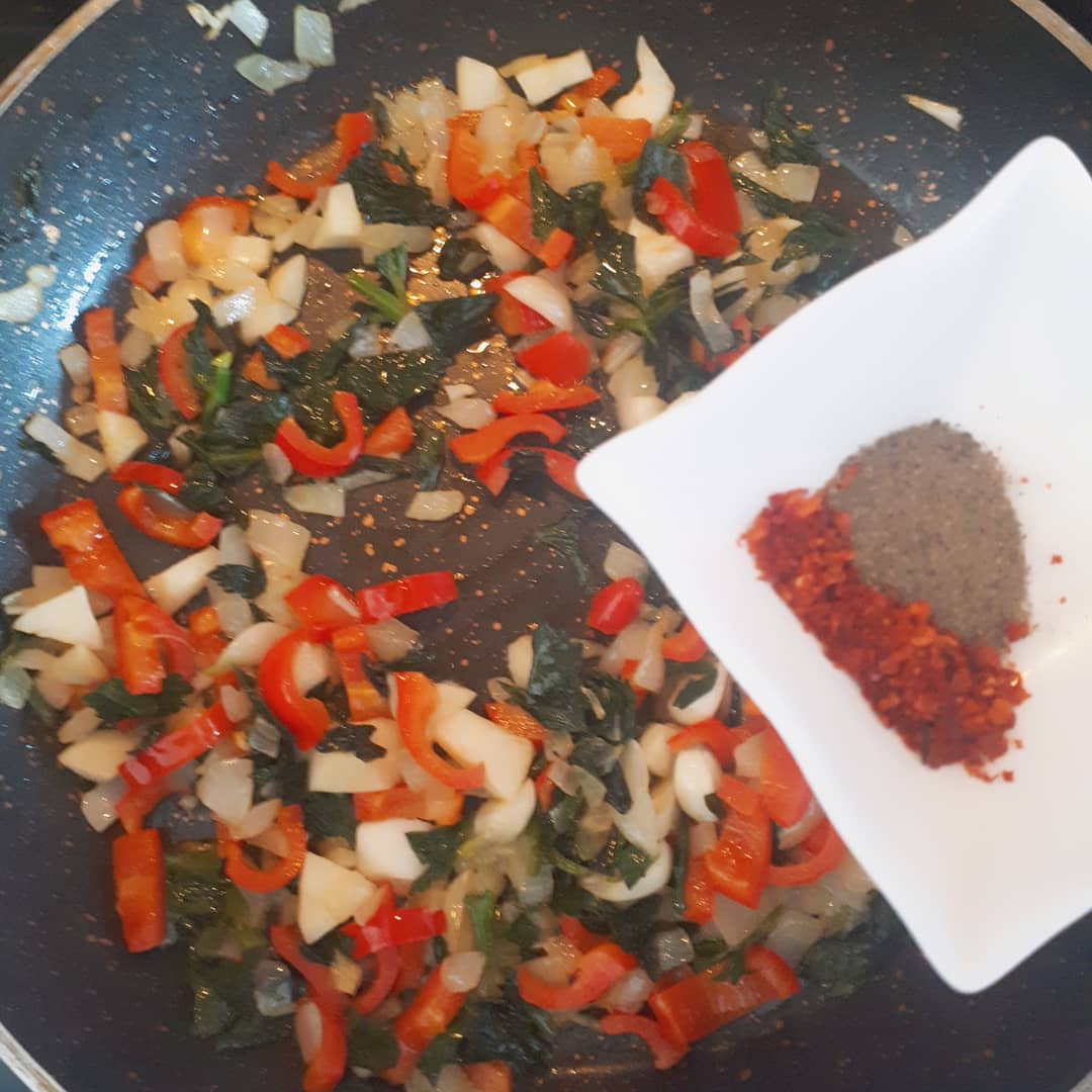 • Kavrulan sebzelere domates sosu, baharatlar eklenir ve karıştırılır.