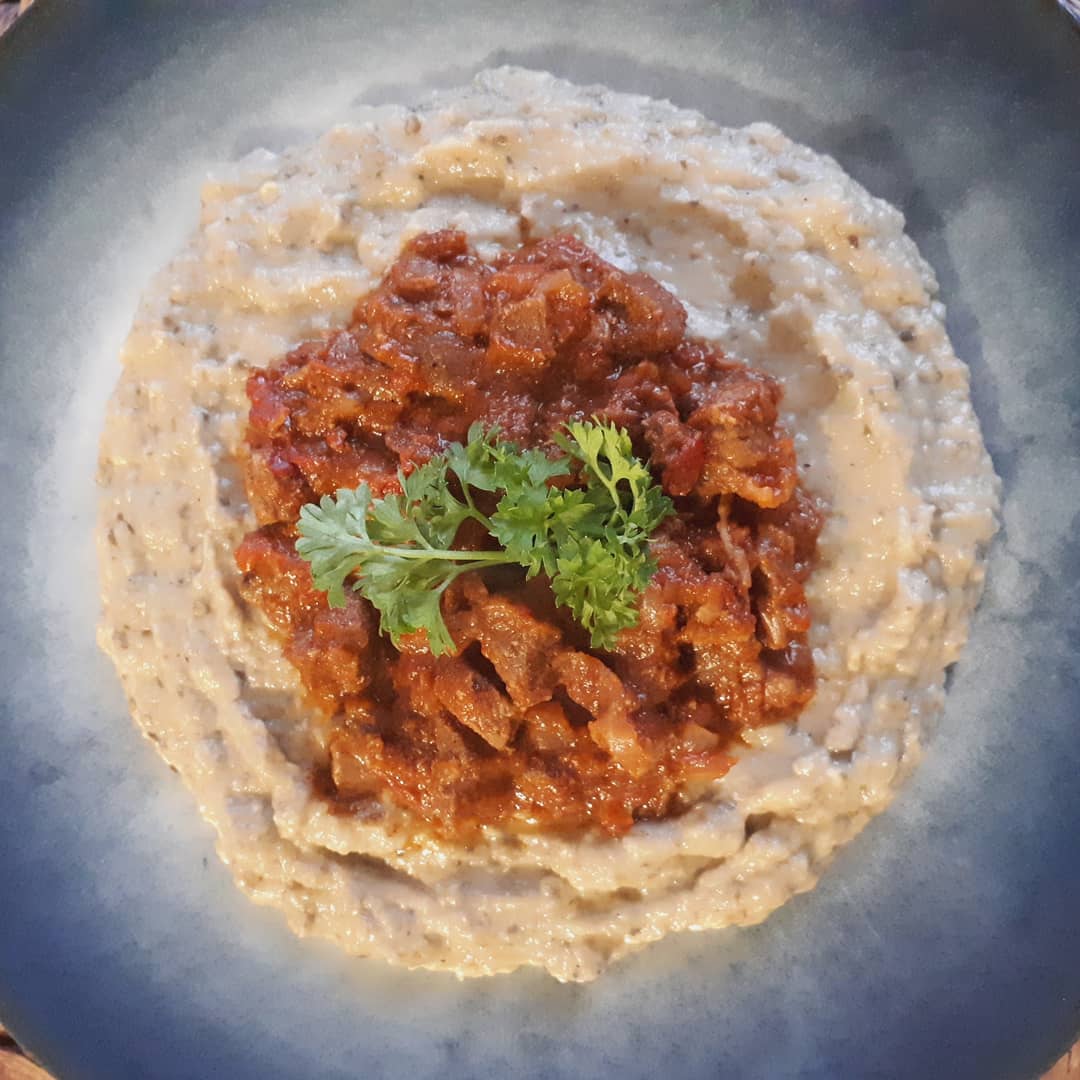 - Servis tabağının en altına püre eklenir.Üzerine eti eklenir ve servis edilir.