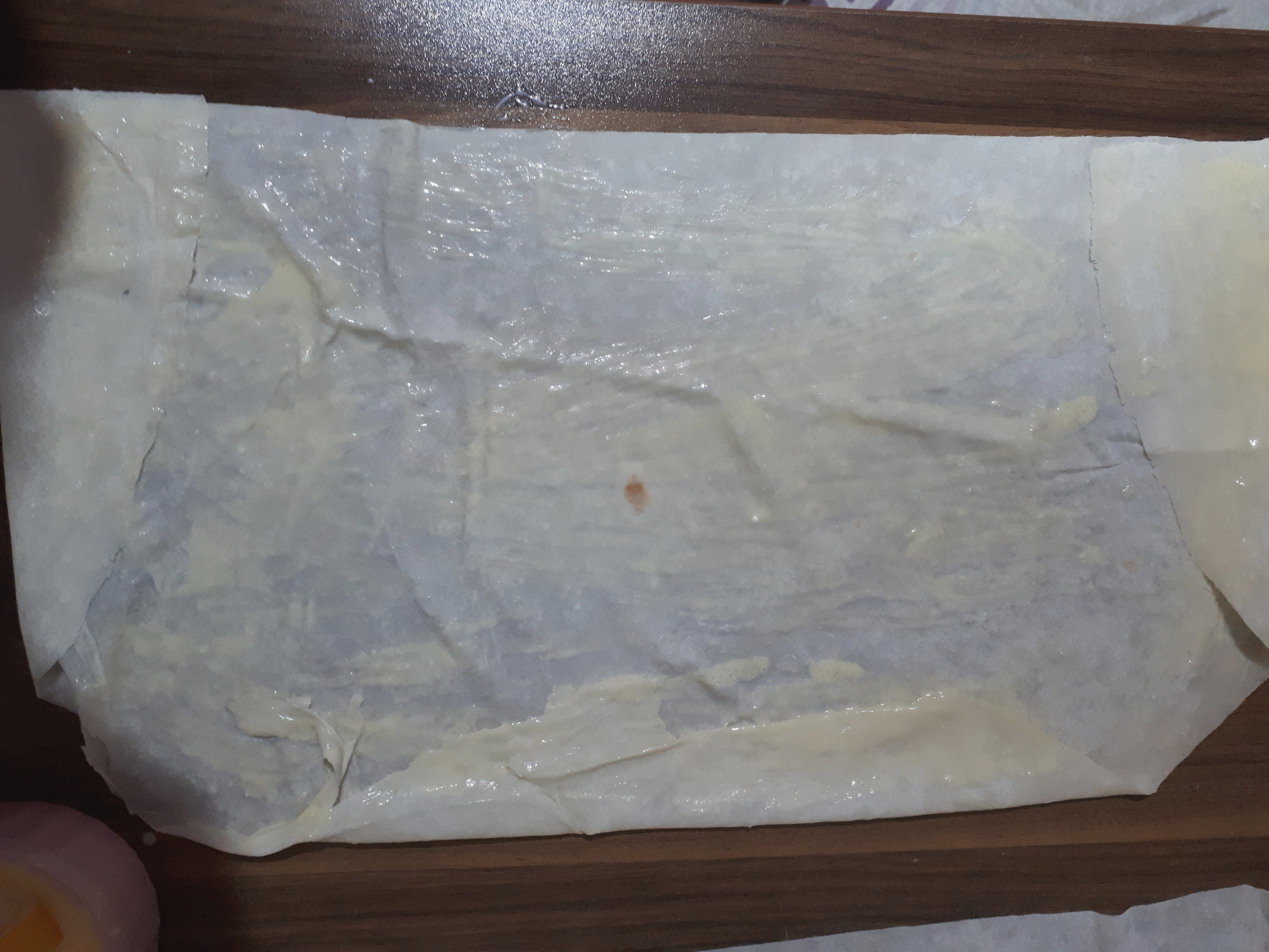 - Böldüğümüz yarım yufkayı sağ, sol ve oval tarafından katlayarak dikdortgen hale getirelim.