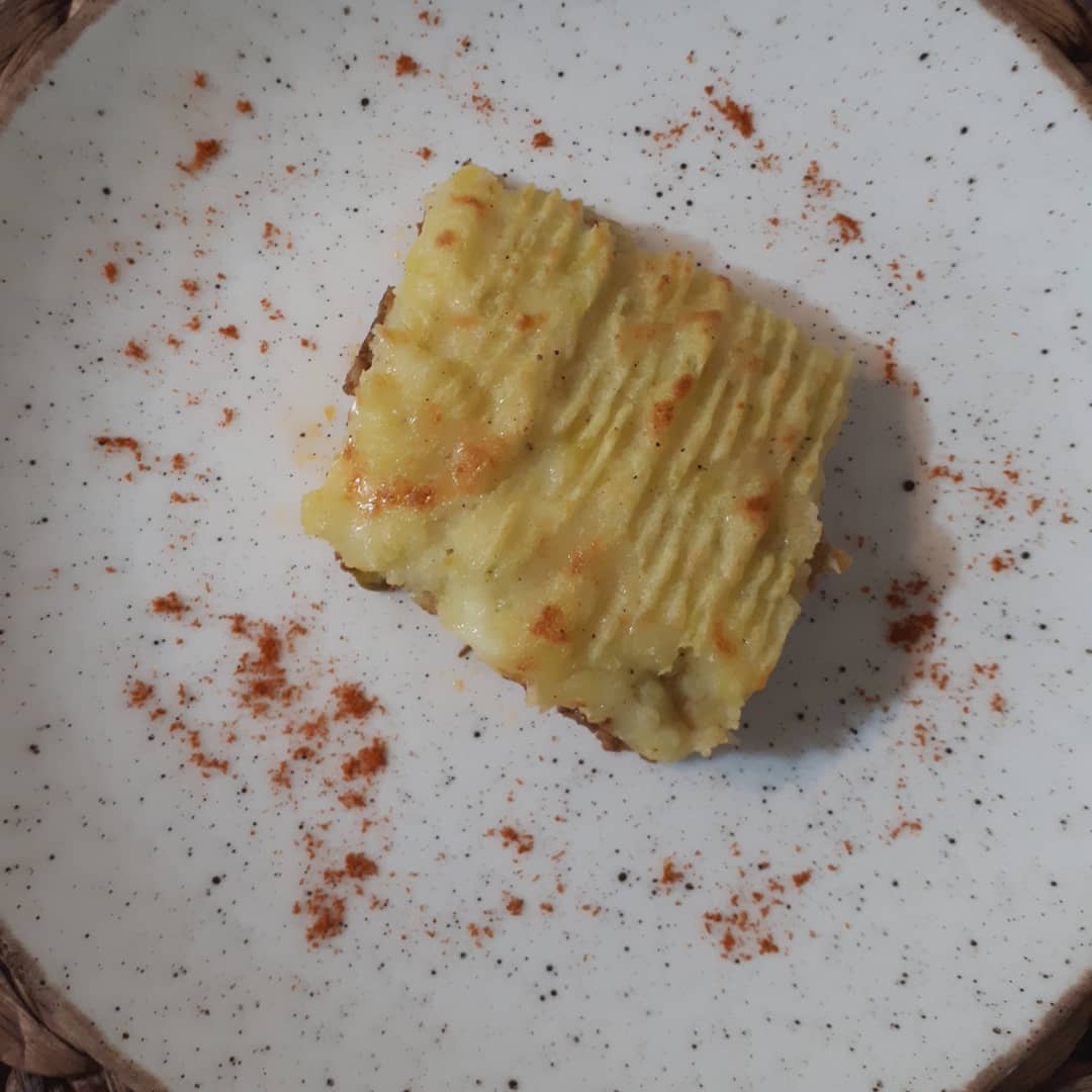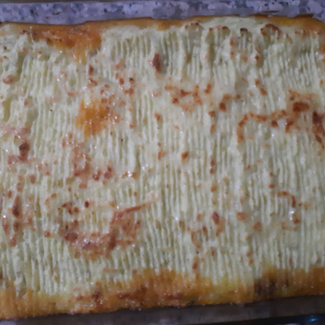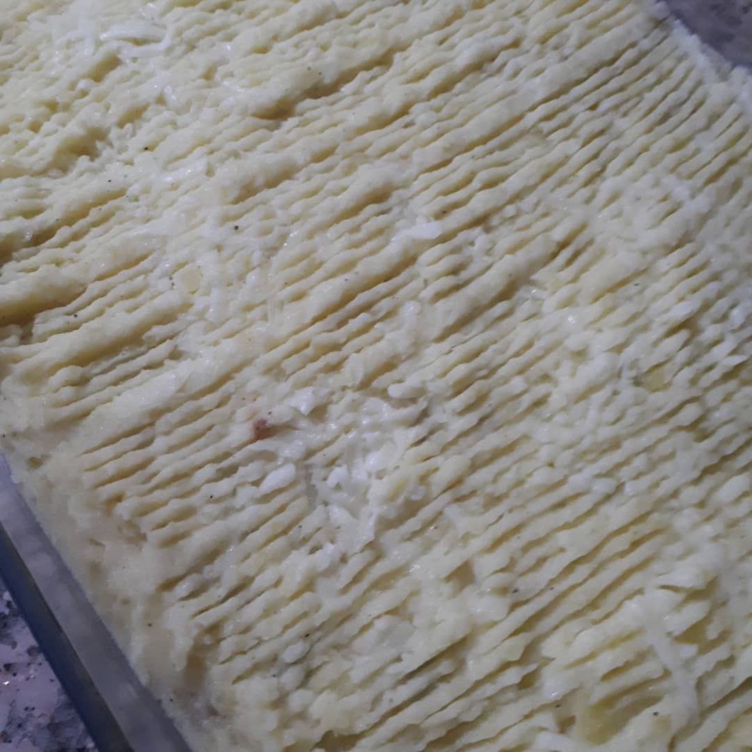 - Dikdörtgen tepsinin icerisine ilk once sote eklenir ve uzeri düzeltilir. Daha sonra patates püresi eklenir. Çatal yardimi ile uzerine cizikler yapılır.