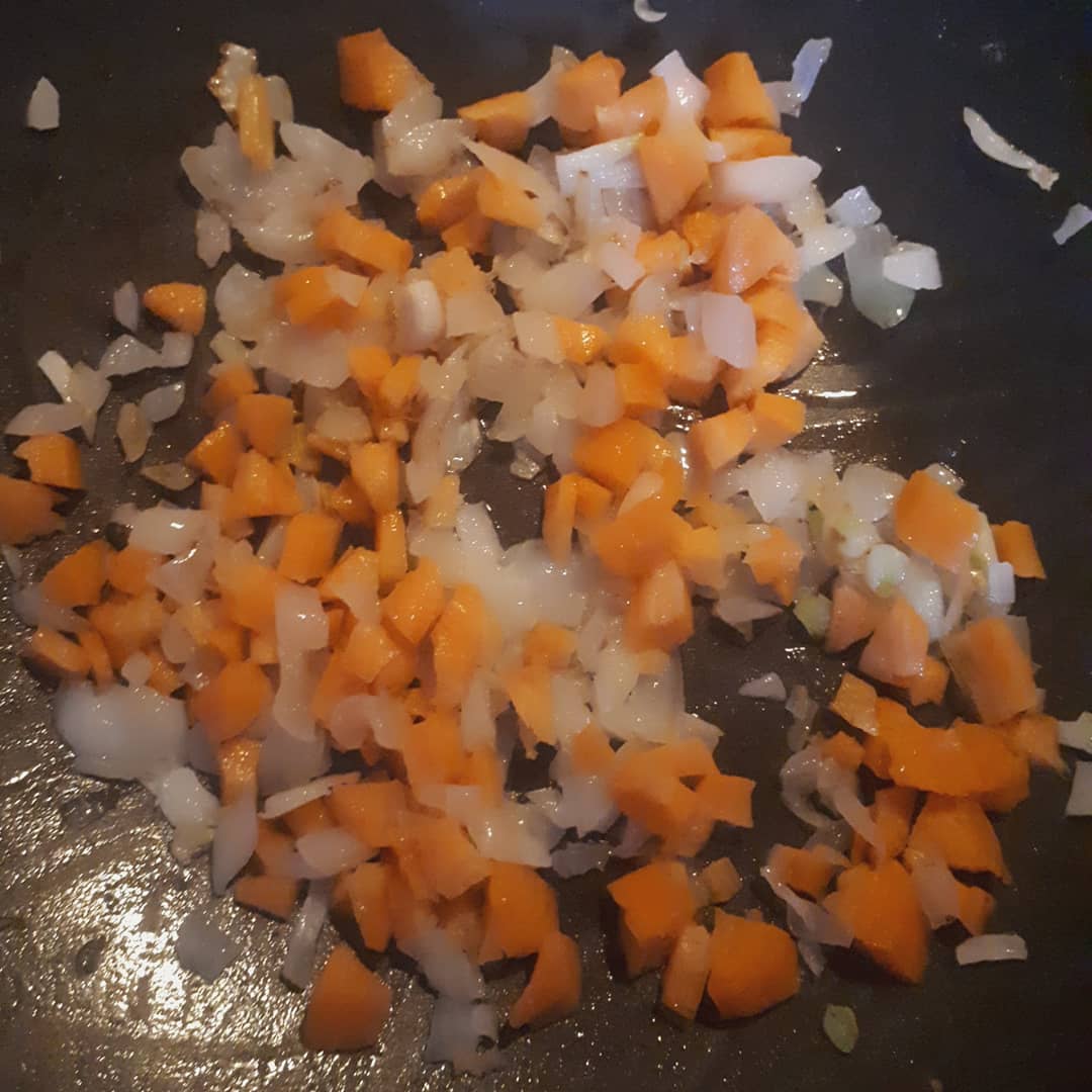 - Az yağda soğan kavrulur.İcerisine küp küp dogranmis havuç eklenir.