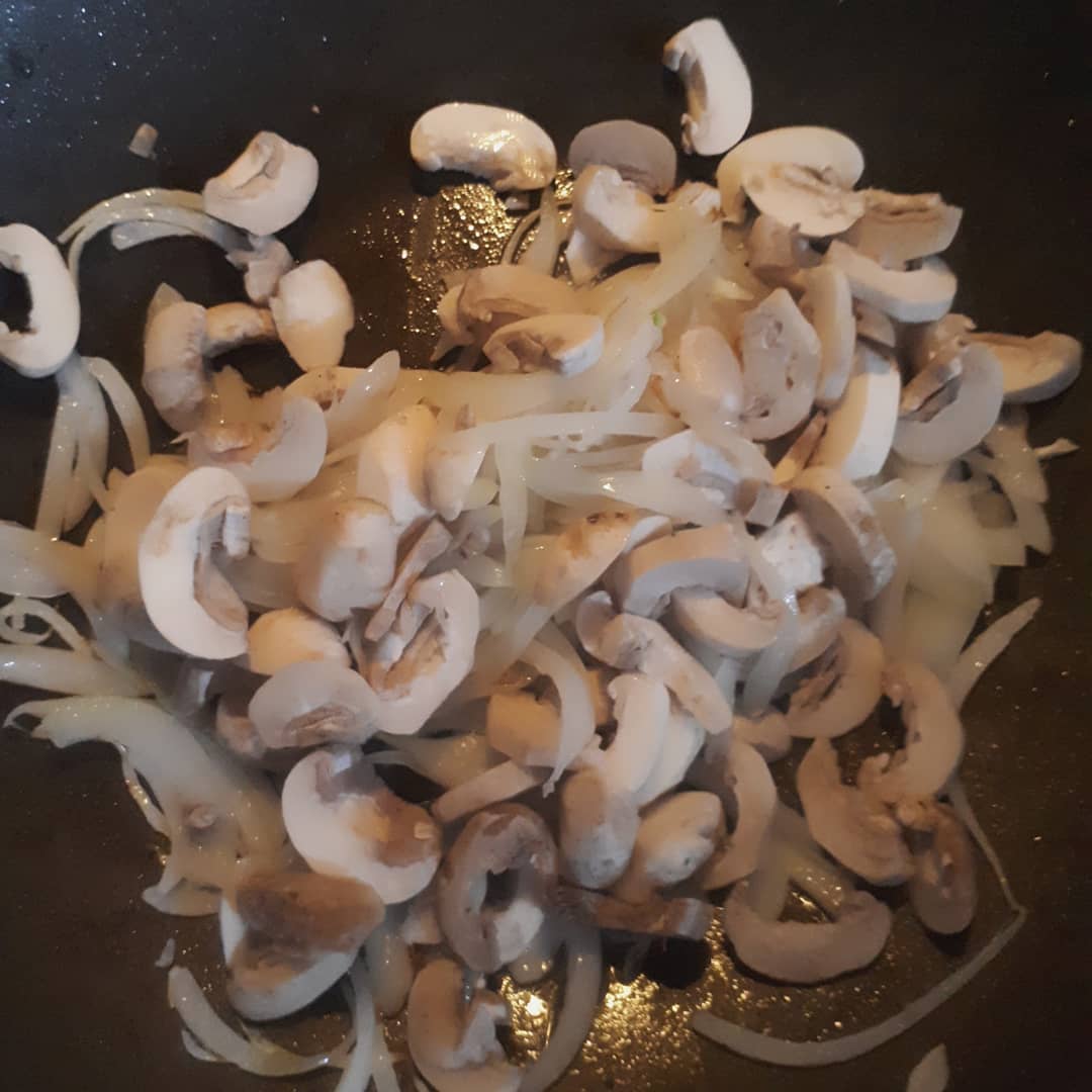 - Tavada tereyağını eritelim, içerisine halka halka doğranan soğanları ekleyelim.Soğanlar öldükten sonra temizleyip kestiğimiz mantarları ekleyerek kavuralım.