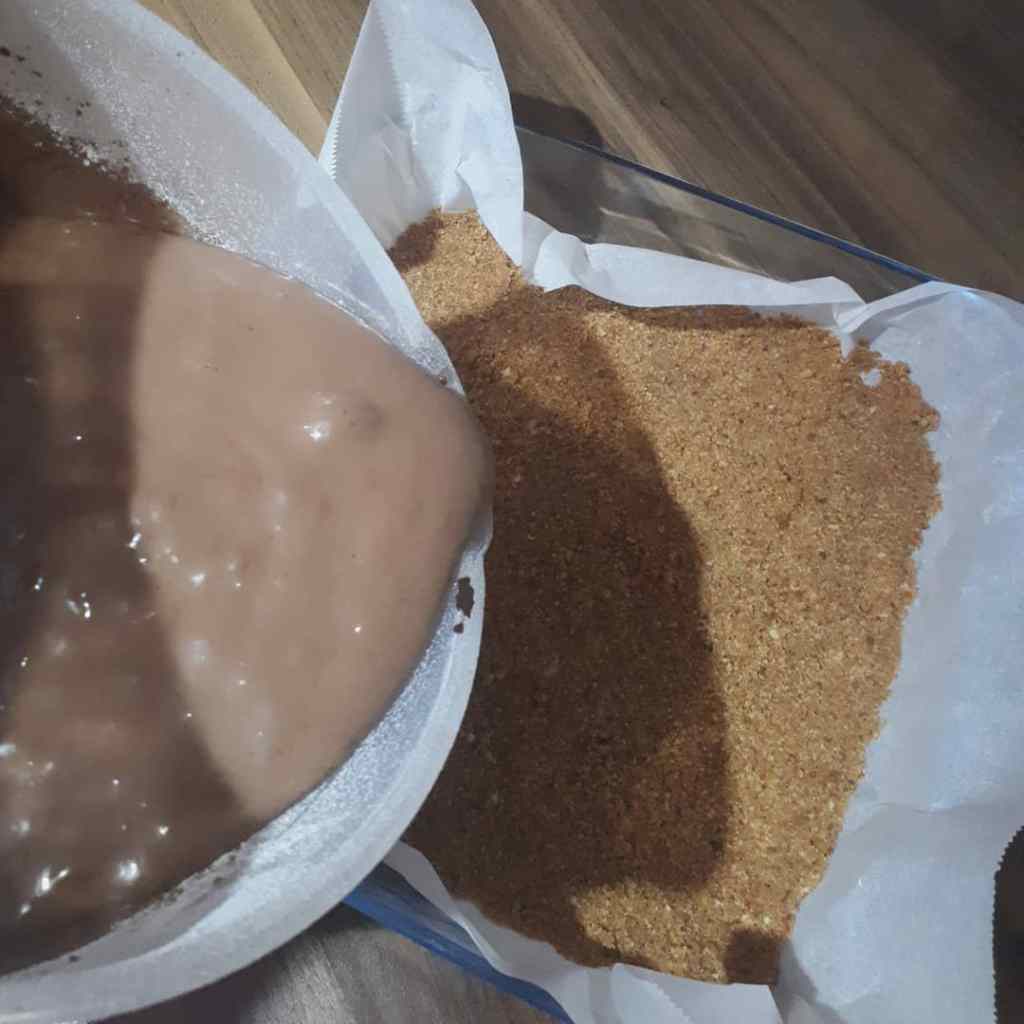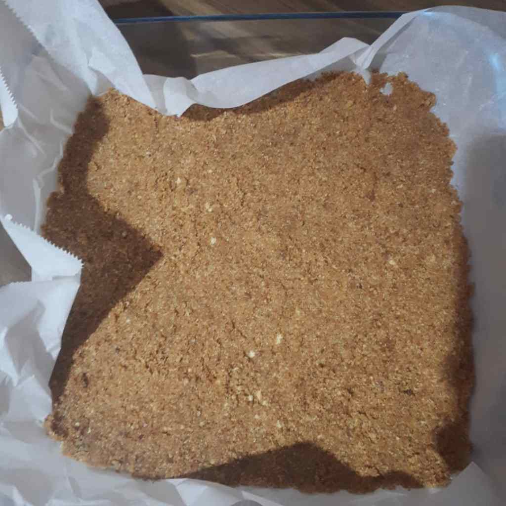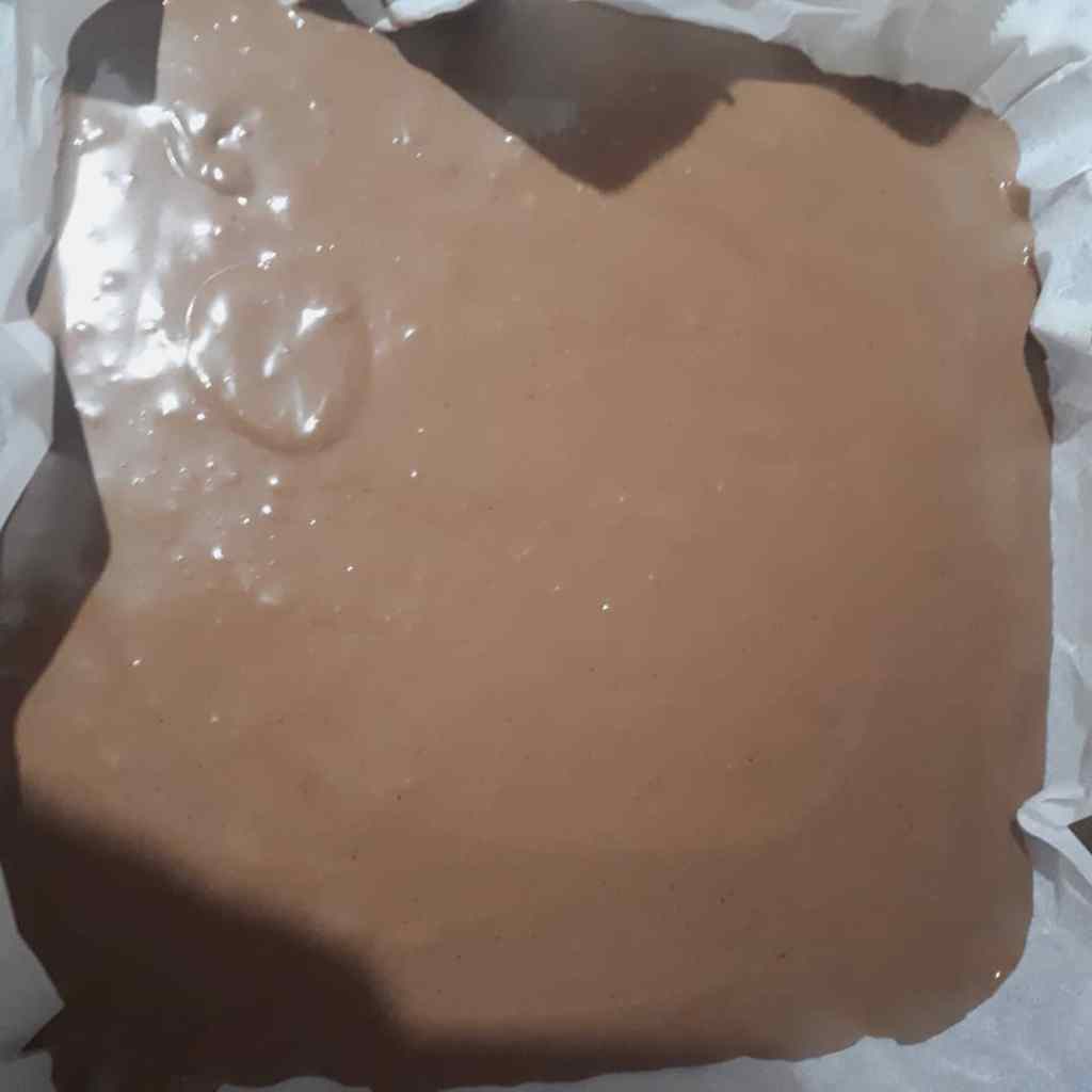 - Kare borcam icerisine yağlı kağıt serelim ve karışımımızı dökelim. Kaşık yardımı ile düzeltelim.