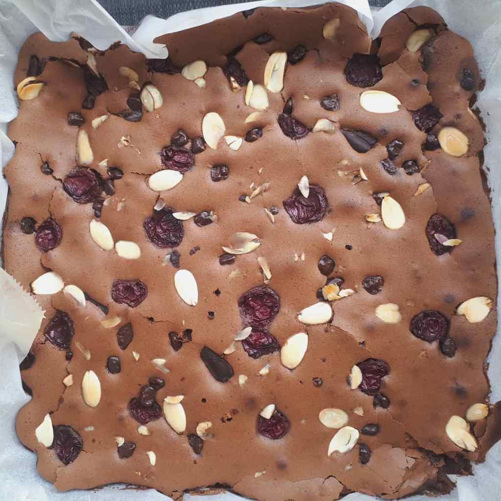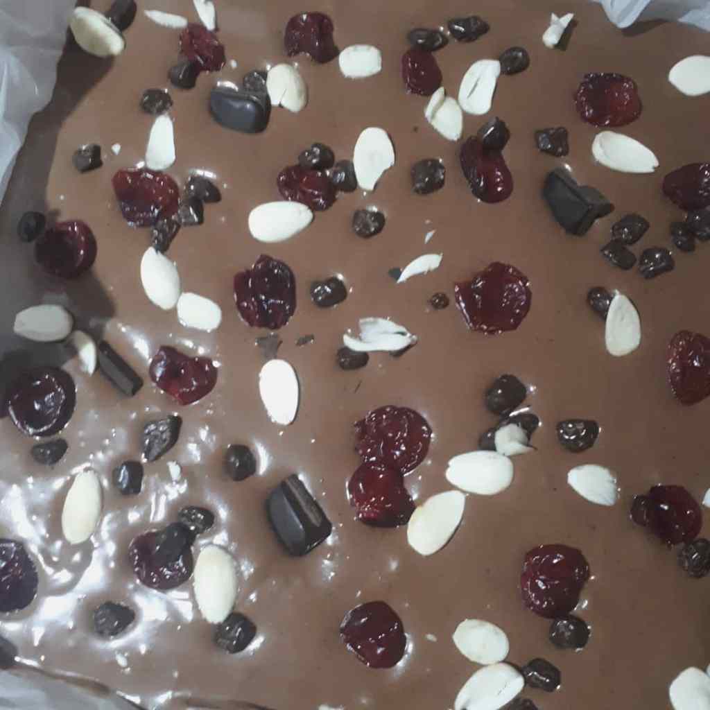 - Üzeri için dondurulmuş vişne aldım ancak önceden süzgece koyup suyunu salmasını bekledim.Eger bu sekilde yapmazsanız kekin o bölümünü ıslatacak ve istediğimiz lezzeti yakalayamayacağız. Vişnemizi ekledikten sonra çikolata ve bademleri de ekleyelim.