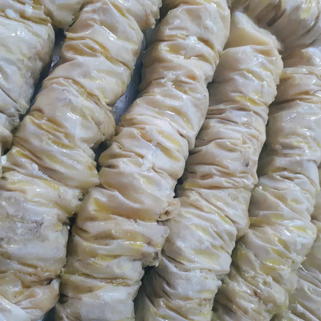 ❄Yufkamızı oklava yardımı ile saralım ve elimizle büzüştürelim.