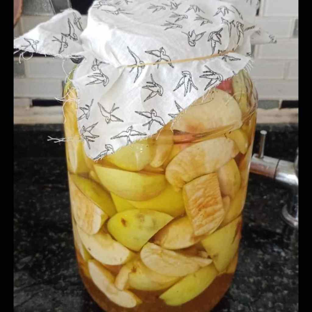 2 kiloluk kavanozunuzun yarısına gelecek kadar elmalar koyulur.Üzerine temiz içme suyu ilave edilir. Şekerini de ilave ettikten sonra resimde görüldüğü gibi bir bez yardımı ile ağzı kapatılır, mayalanması için hava alması gerektiğinden kapak kullanmıyoruz.