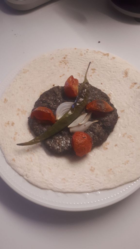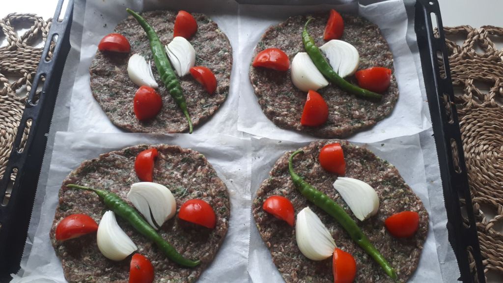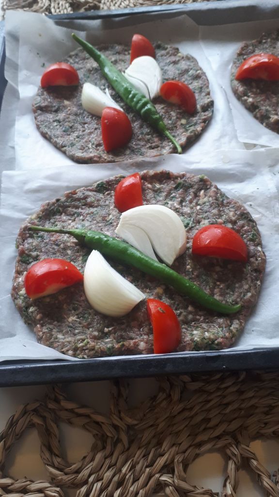 Yağlı kagidin üzerini hafifçe ıslatıp 1 parça kıymayı elinle açıp düzelteceksin.Üzeri domates biber ve soğan ile süslenir.