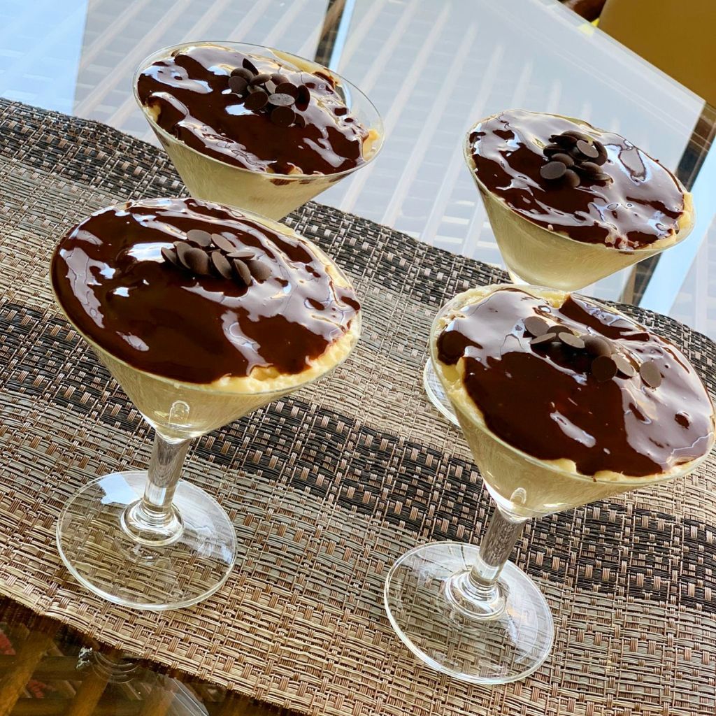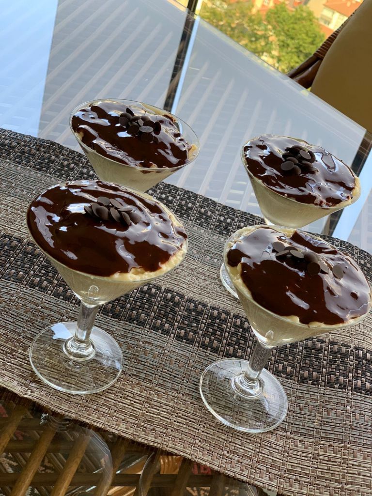Ilıyan muhallebinin icerisine krema ilave edilir ve kedi dilleri parcalara bölünerek icerisine atılır.Daha sonra cuplara pay edilir ve üzerine cikolata sosu dökülerek buzdolabına kaldırılır.Soguduktan sonra servis.