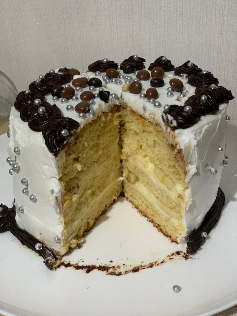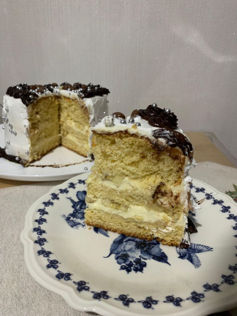 Pandispanya piştikten sonra fırından çıkarıp telin üzerine koyup soğumasını bekleyelim.Sonra kenarlarından bir bıçak yardımı ile ayıralım.Dikkatlice çıkaralım.3 eşit parçaya bölelim.Ben ip kullanarak kestim kolay oldu.Daha sonra her parçayı sütle ıslatarak aralarına hazırladığımız krema ve muzu ilave ederek 3 katı tamamlayalım.Sonra kalan krema ile üzerini kapatalım.Dolaba kaldıralım.Krem şantiyi 1 bardak süt ile iyice çırpqım.Dış yüzeyi donmuş olan pastamızın üzerini kaplayıp süslemesini yapalım.
