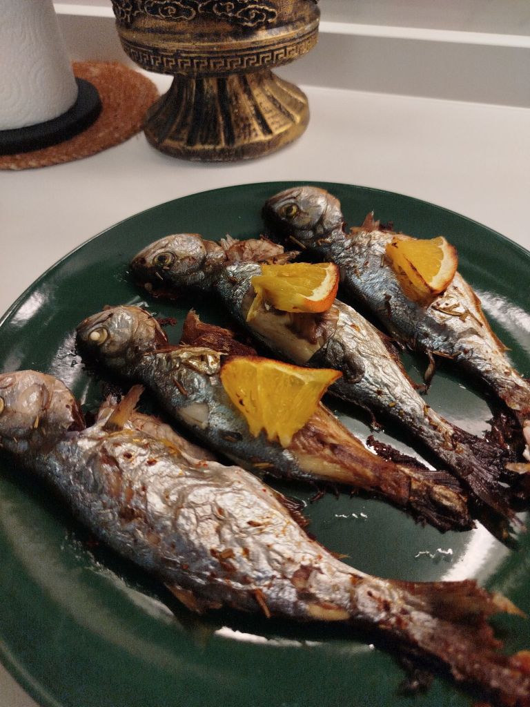 Yağlı kağıt üzerine balıkları dizelim, portakal dilimleri ve defne yaprakları serpelim ve 180° fırında üzerine ıslattığımız yağlı kağıdı serip 15 dk. pişirelim. Sonrasında yağlı kağıdı çıkarıp üzeri kızarana kadar pişirelim. Afiyet;)