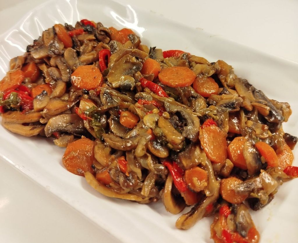 Tencereye sıvıyağ ve soğanı alıp kavuralım. Üzerine havuç ve biberleri ilave edelim biraz kavrulduktan sonra mantarları ekleyelim.