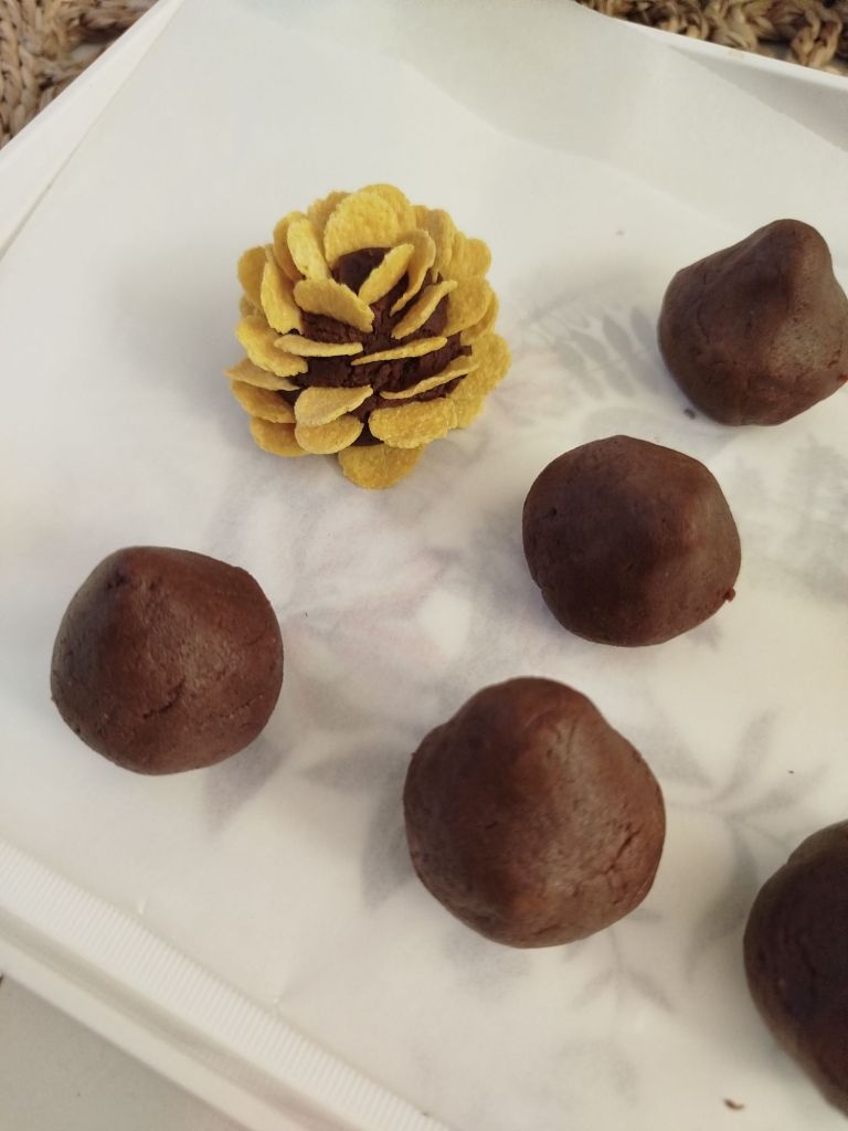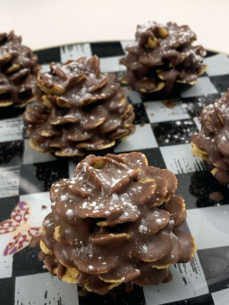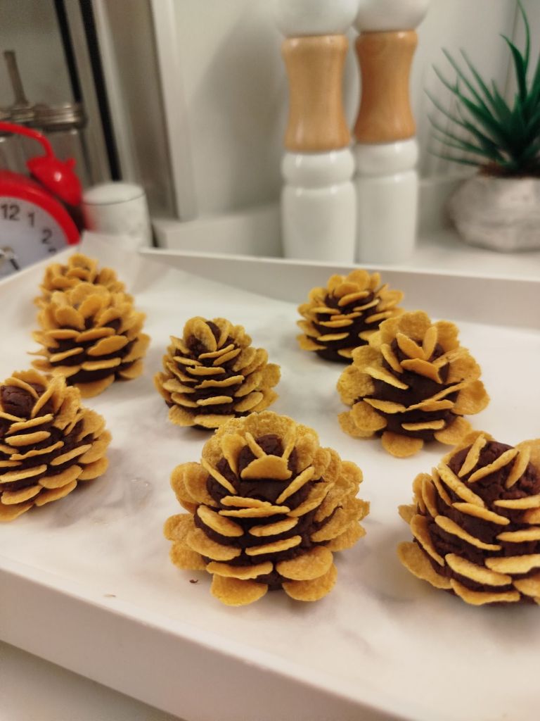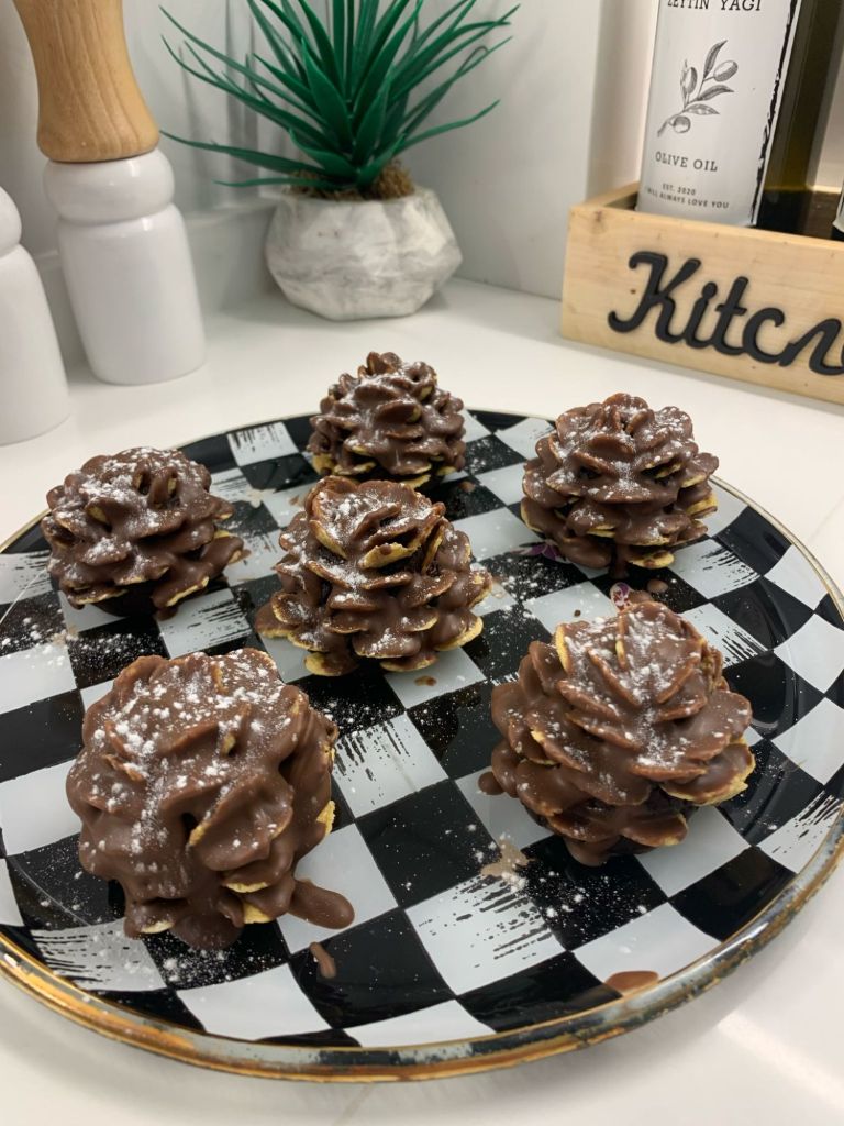 Fotoğraftaki gibi şekillendirip mısır gevreklerini dizelim. Dolapta yarım saat bekletin.Sonrasında benmari usulü erittiğimiz çikolatayı üzerine dökelim. Buzlukta biraz donmasını bekleyin, servis ederken üzerine pudra şekeri serpin.