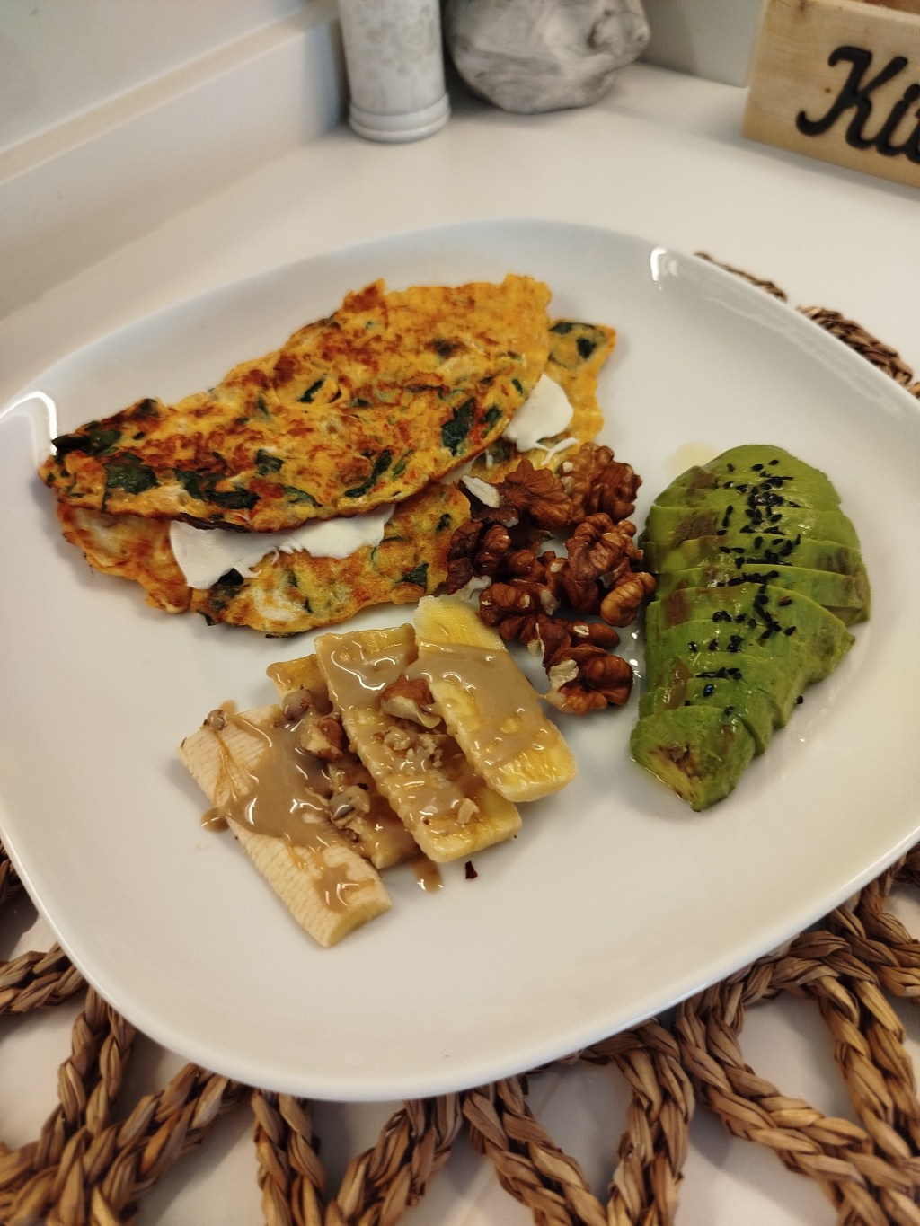 Tüm malzemeleri karıştırın. Tavaya az yağ döküp arkalı önlü pişirin. Arasına peynir koyup katlayın afiyetle yiyin. Yanına avokado kesebilir, tatlı isteği için yarım muz üstüne 1 tatlı kaşığı tahin döküp afiyetle yiyebilirsiniz.