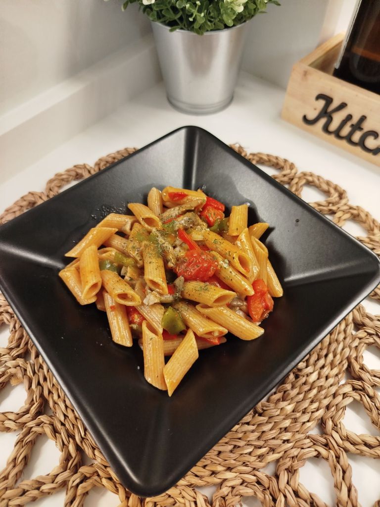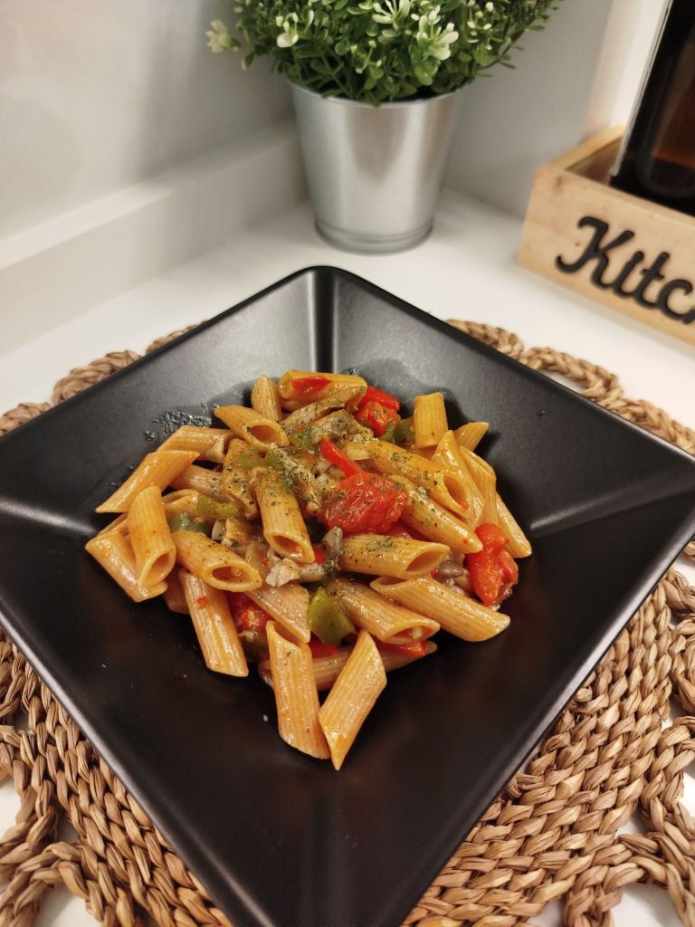 Az yağda doğranan mantar ve biberleri soteleyelim. Üzerine ikiye bölünen domatesleri ilave edelim. Tuz ve karabiber ekleyip soteleyelim. Makarna suyunu ilave edip 5 dk kadar pişirelim. Sonrasında içerisine süzdüğümüz makarnayı ilave edip karıştıralım. Servis öncesi nane serpelim. Afiyet;)