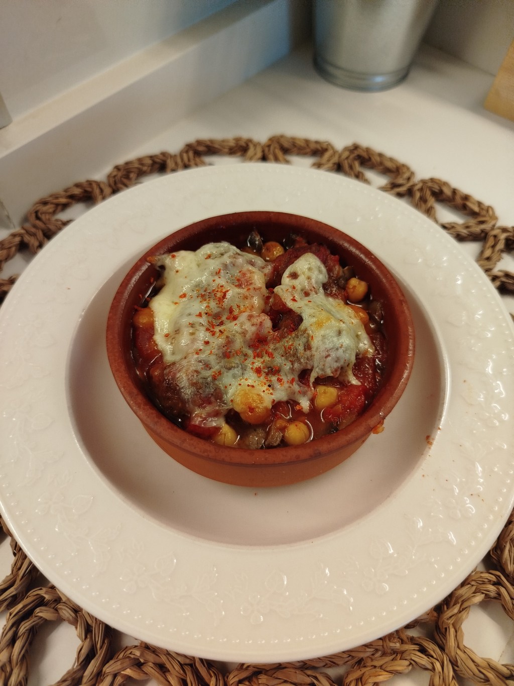 Üzerine sırasıyla mantar, köfte, nohutu koyun. Üzerine tavada domates sosu salça ve sıvıyağı hafif ısıtıp dökün.
