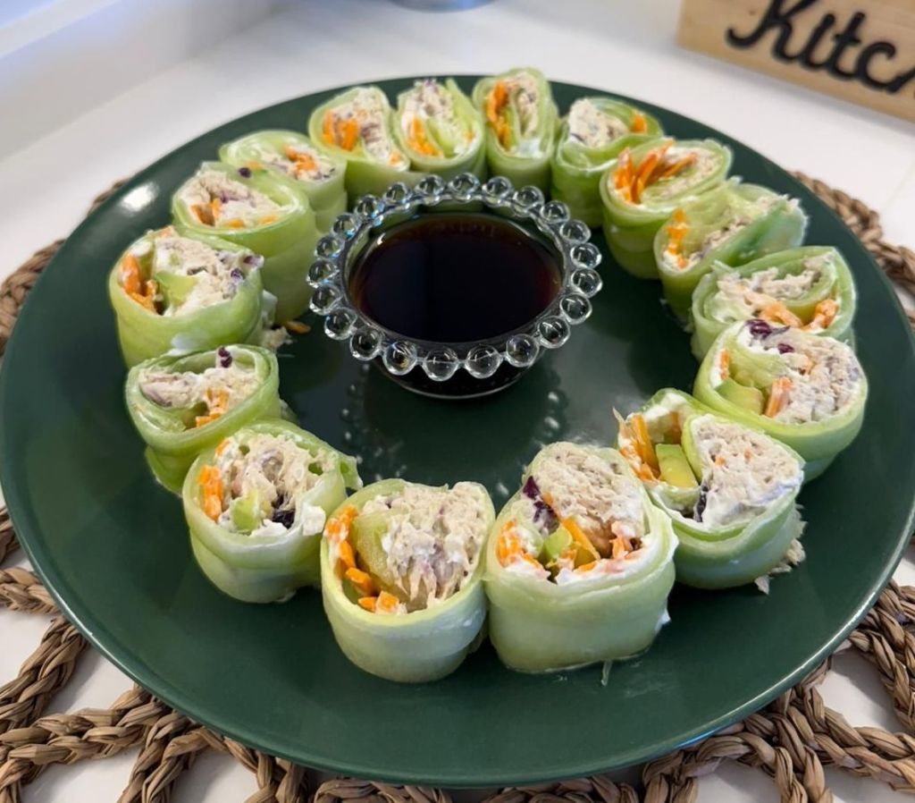 Salatalıkları soyacak yardımı ile ince ince yapalım. Sonra bir peçetenin üzerine sırt sırta dizelim. Üzerinin ıslaklığını peçete ile alalım. Üzerine krem peyniri sürelim. Hindi karışımını uzun bir şekilde yayalım. Arkasına sotelenen havuç, avokado dilimi koyup saralım ve dilimleyelim. Soya sosu yanında servis.