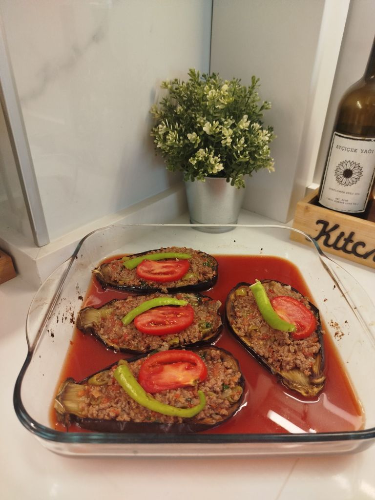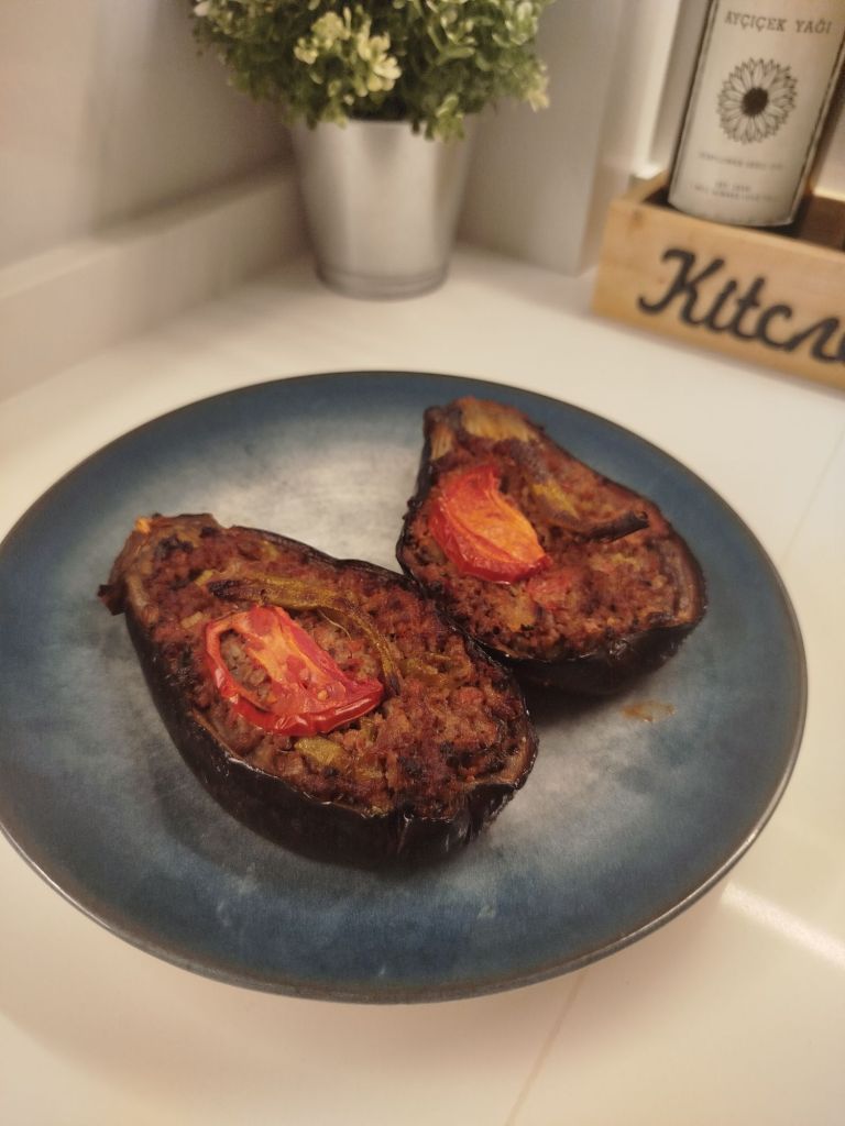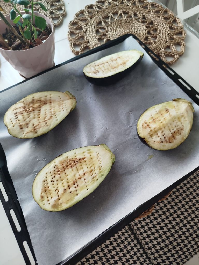 - Patlıcanı ikiye bölelim. Tuzlu suda bekletelim. Sonrasında çatalla delikler açalım, zeytinyağı sürelim.180° fırında 45 dk. içi yumuşayana kadar pişirelim.