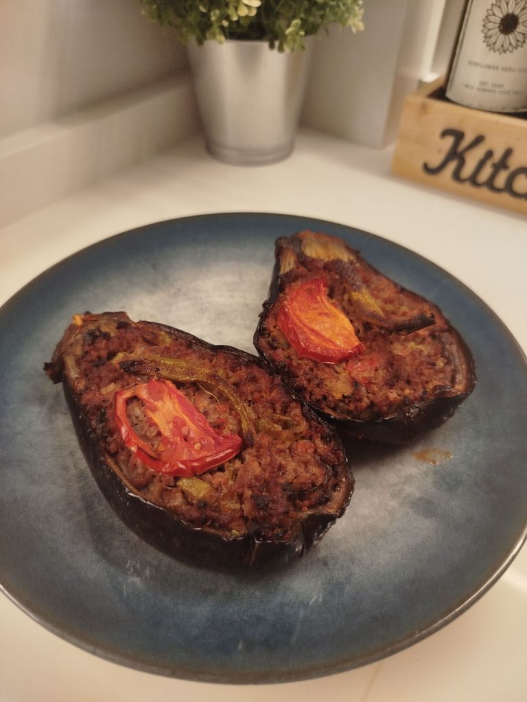 - Fırından çıkan patlıcanları borcama alalım, içini ezelim. Üzerine iç malzemesini koyalım. Süslemek için domates ve biber ekleyelim.
