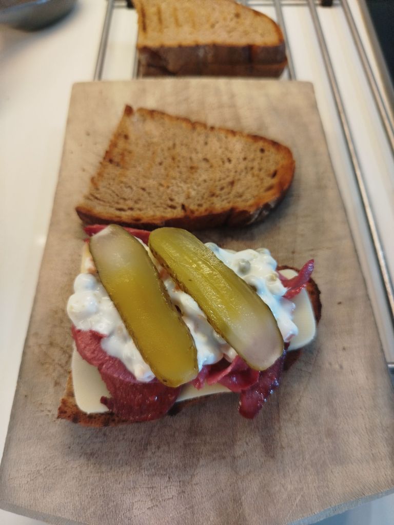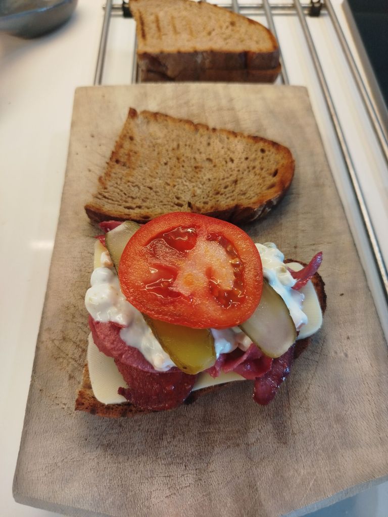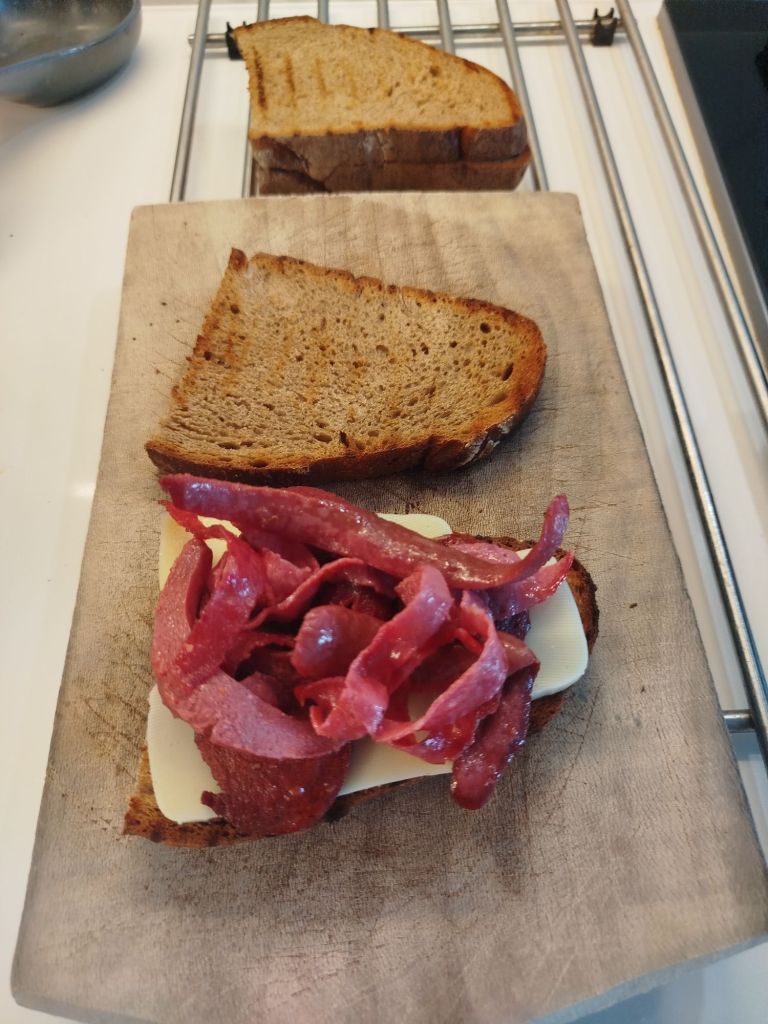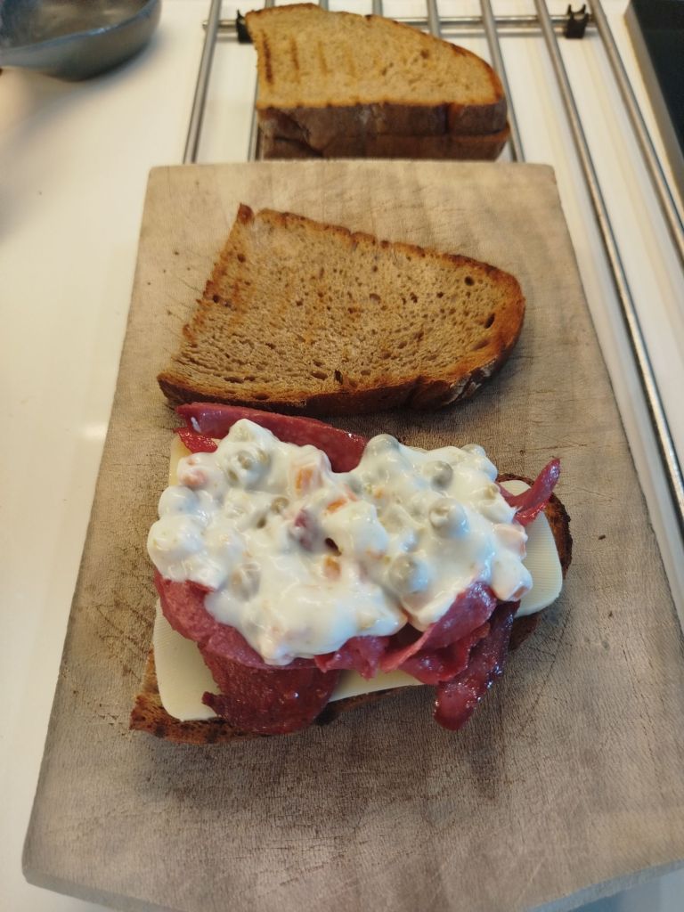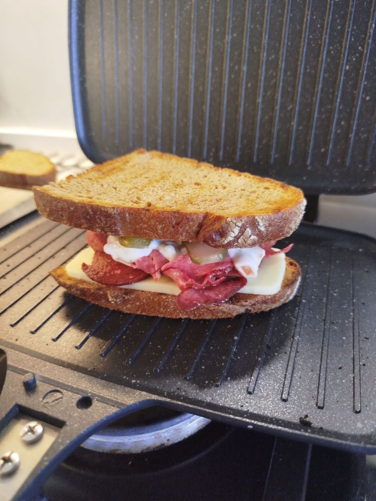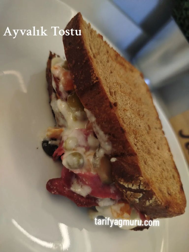 Kızarmış ekmeğe sırayla kaşar, sosis salam karışımı, garnitür, turşu,domates koyup makinede bastıralım.
