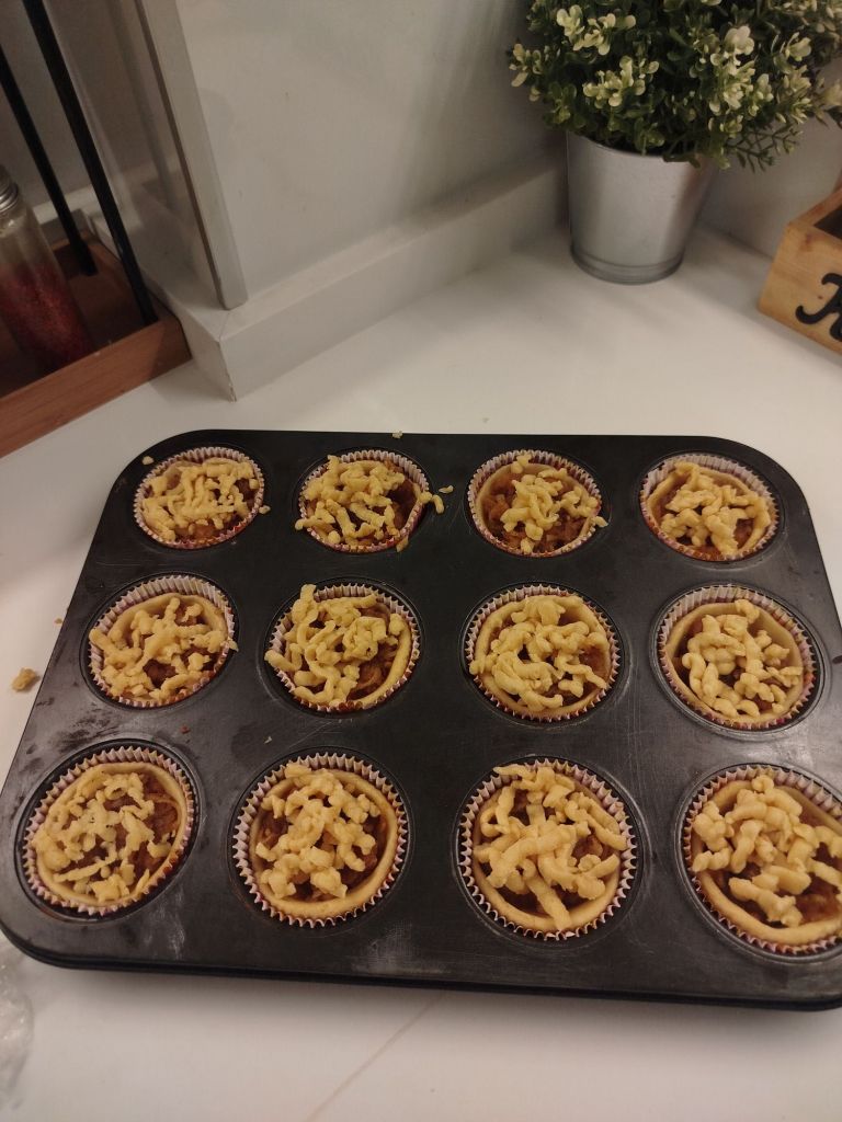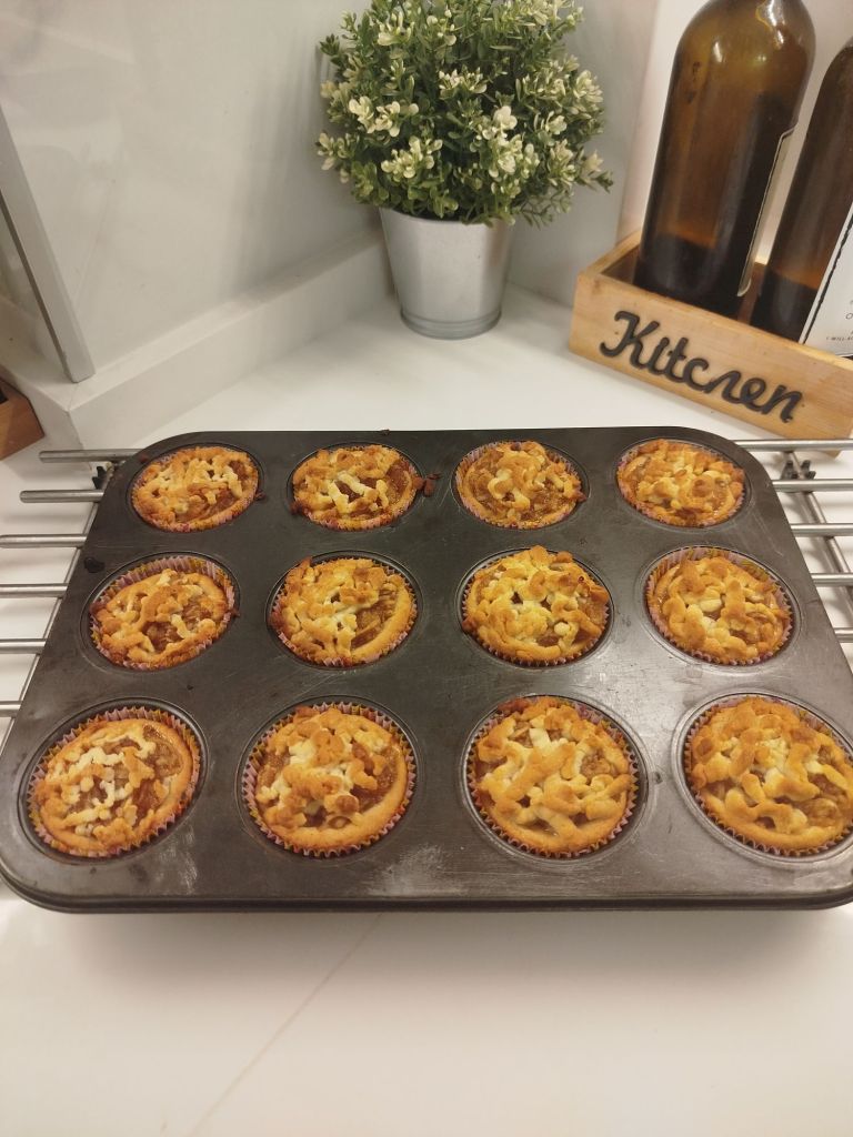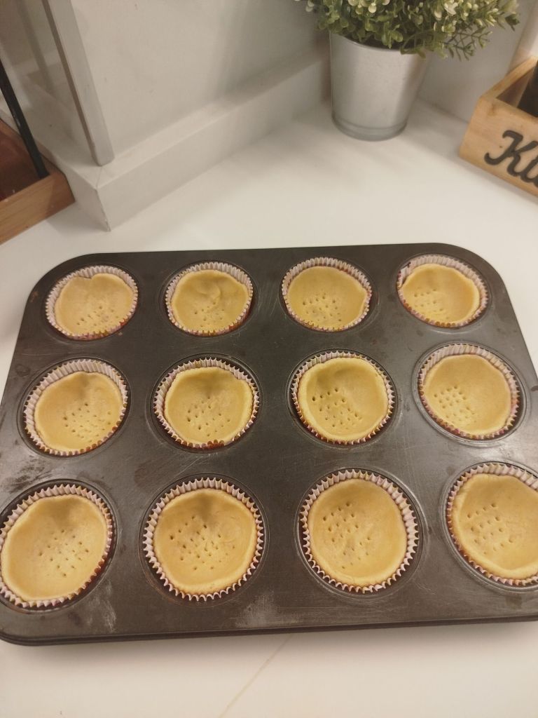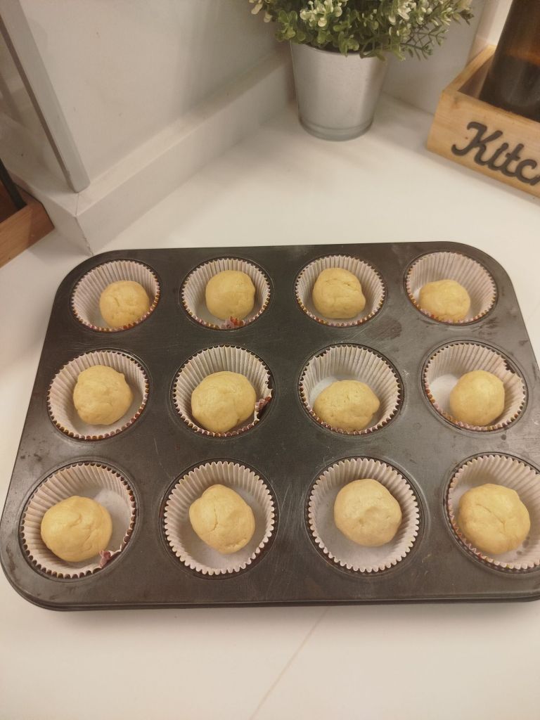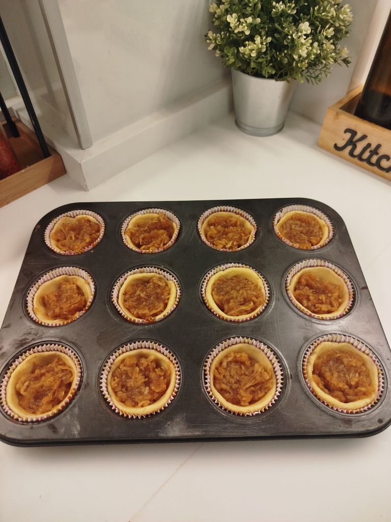 Yumurta, Sıvıyağ, pudra şekeri, yoğurt, tuz koyup çırpın sonra içerisine margarin ilave edip yoğurun.Yağın diğer malzemelerle karıştığından emin olunca kabartma tozunu ekleyip unu azar azar ilave edelim. Yumuşacık bir hamur elde edelim. Hamurdan ufak bir portakal büyüklüğünde ayırıp buzluğa koyalım. Tepsimize kağıdımızı koyalım. Her pasta kağıdına hamurumuzu eşit paylaştıralım. Bu hamurdan 24 adet çıkıyor. Hamuru yayalım içerisine çatalla bir iki bastıralım. İçerisine harcımızdan ilave edelim. Üzerine buzluktaki hamuru muz dan rende leyelim.