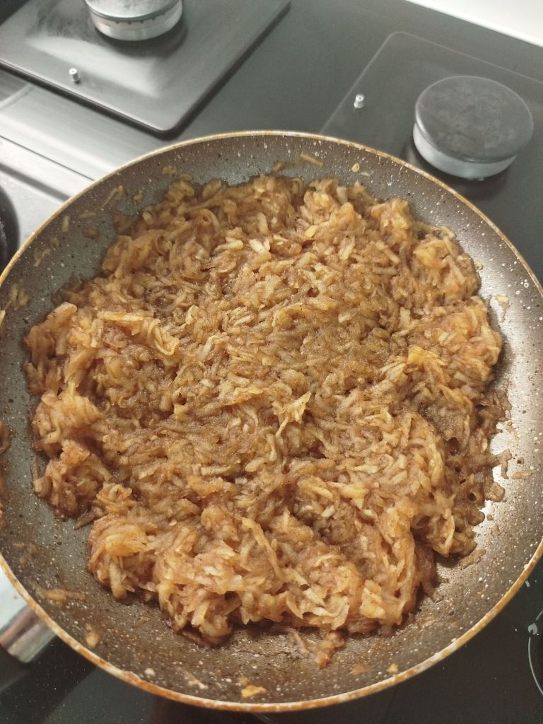 İlk önce elma harcı için elmaları rendeleyelim, tavada elma, şeker ve tarçını suyunu çekene kadar pişirelim.