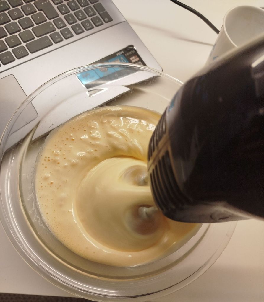 Çırpma İşlemi: Derin bir kapta yumurta ve şekeri, karışım beyaz köpük köpük olana kadar yaklaşık 5 dakika çırpın. (İyi çırpmak kekin kabarmasını sağlar.)